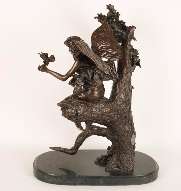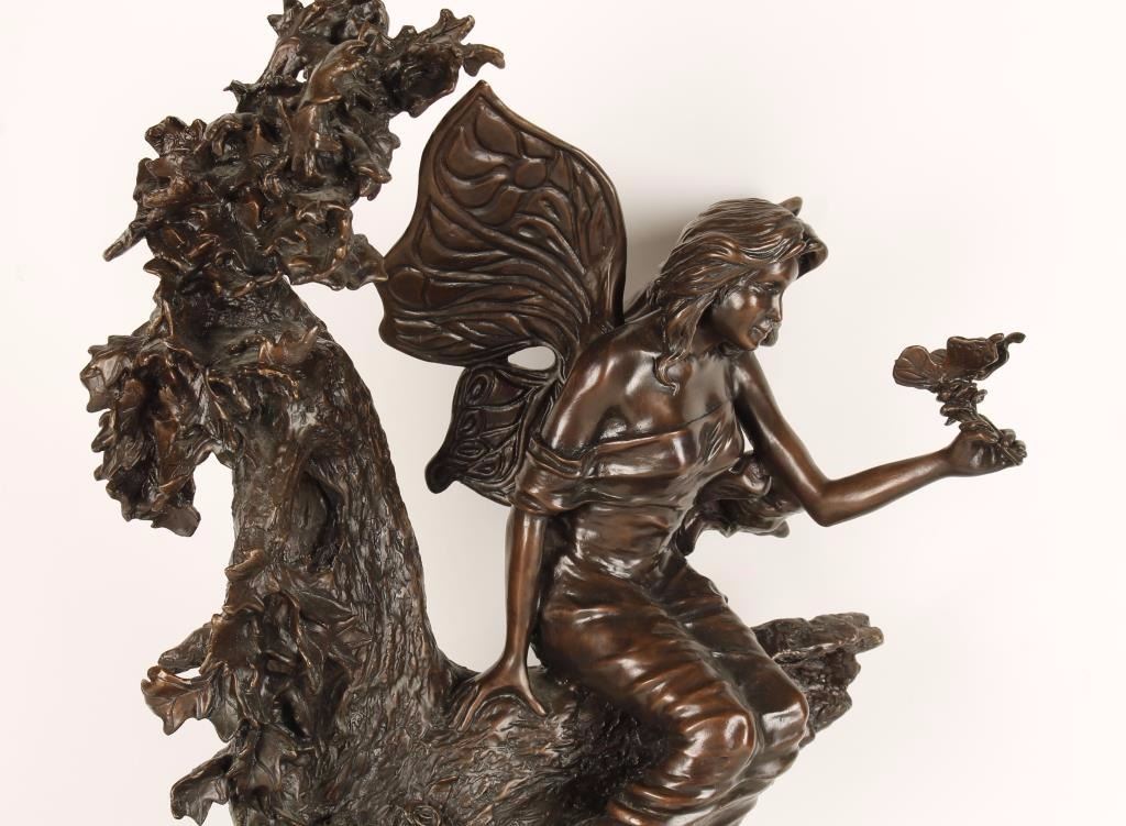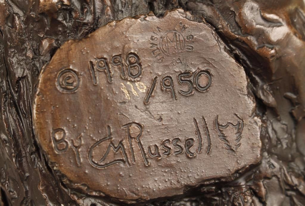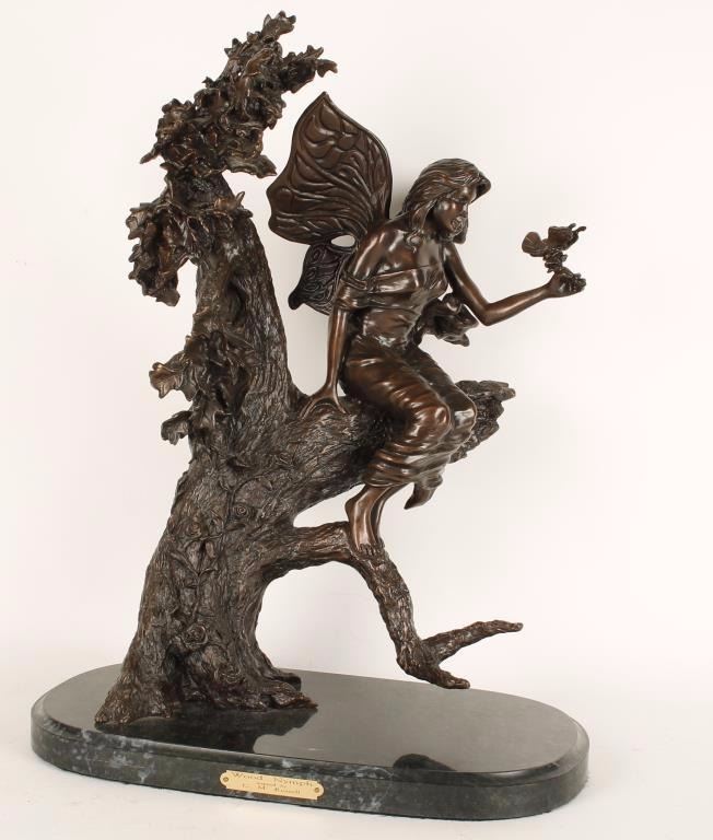 Gorgeous restrike bronze statue depicting a nymph sitting on a branch luring a butterfly with a flower. Bronze sits on a marble base with a plaque that reads "Wood Nymph inspired by C. M. Russell" and the bronze itself is Signed by C.M. Russell dated 1998, in scripted 110/950 & stamped EMI Visalia CA. U.S.A.. Measures approximately 23" x 17" x 13". 'Charlie Russell was an artist of the Old American West. Russell created more than 2,000 paintings of cowboys, Indians, and landscapes set in the Western United States and in Alberta, Canada, in addition to bronze sculptures. Known as 'the cowboy artist',[3] Russell was also a storyteller and author'. Condition is Excellent.