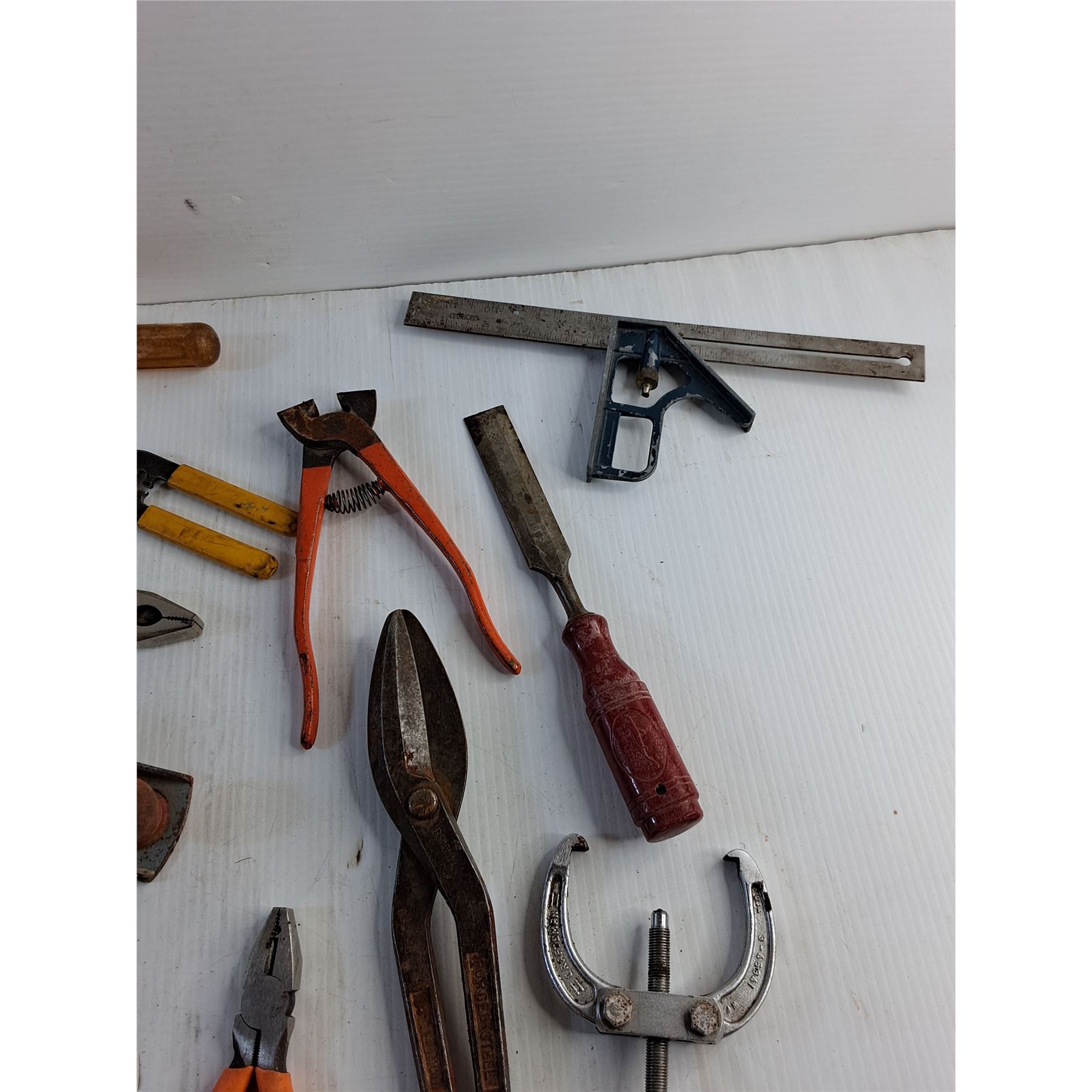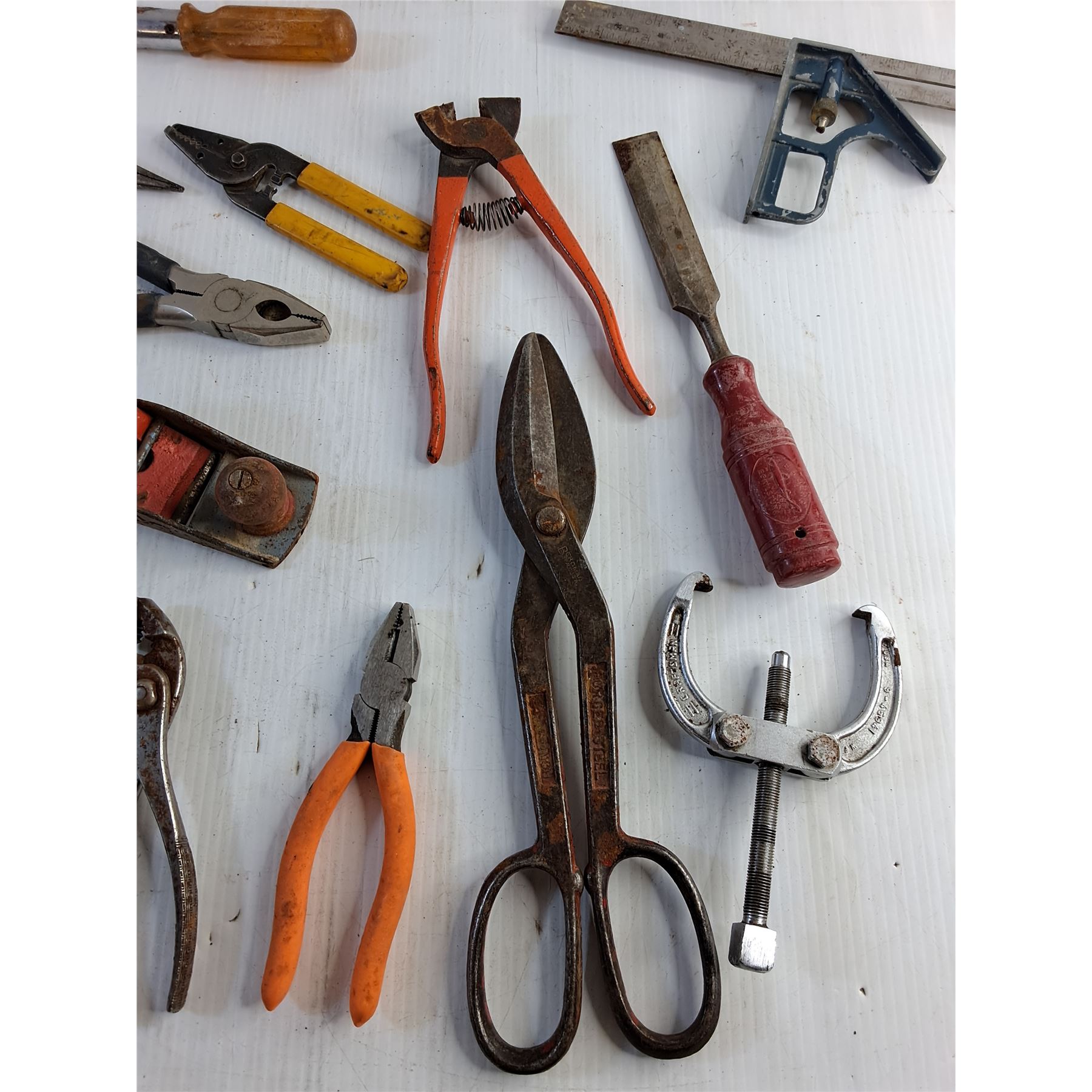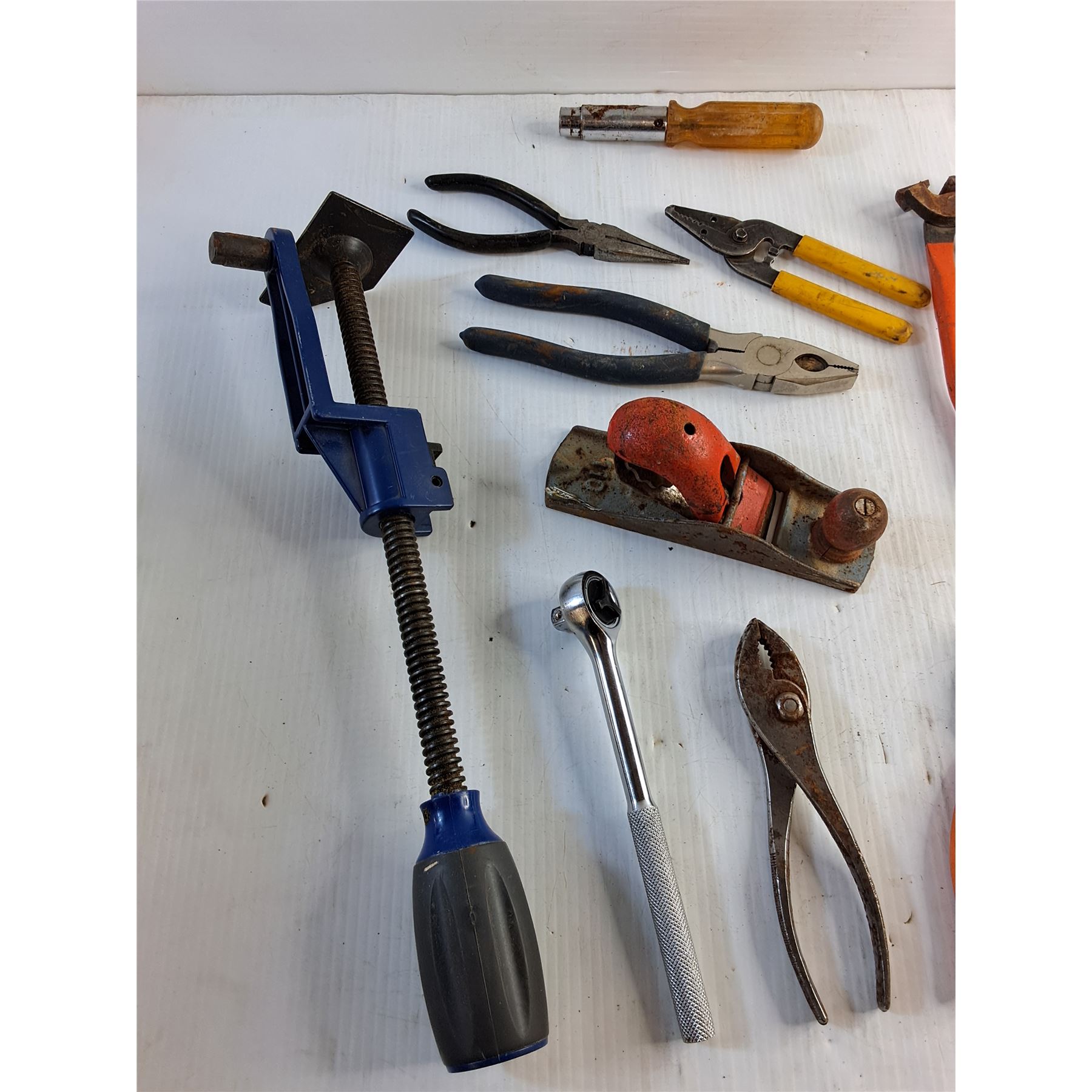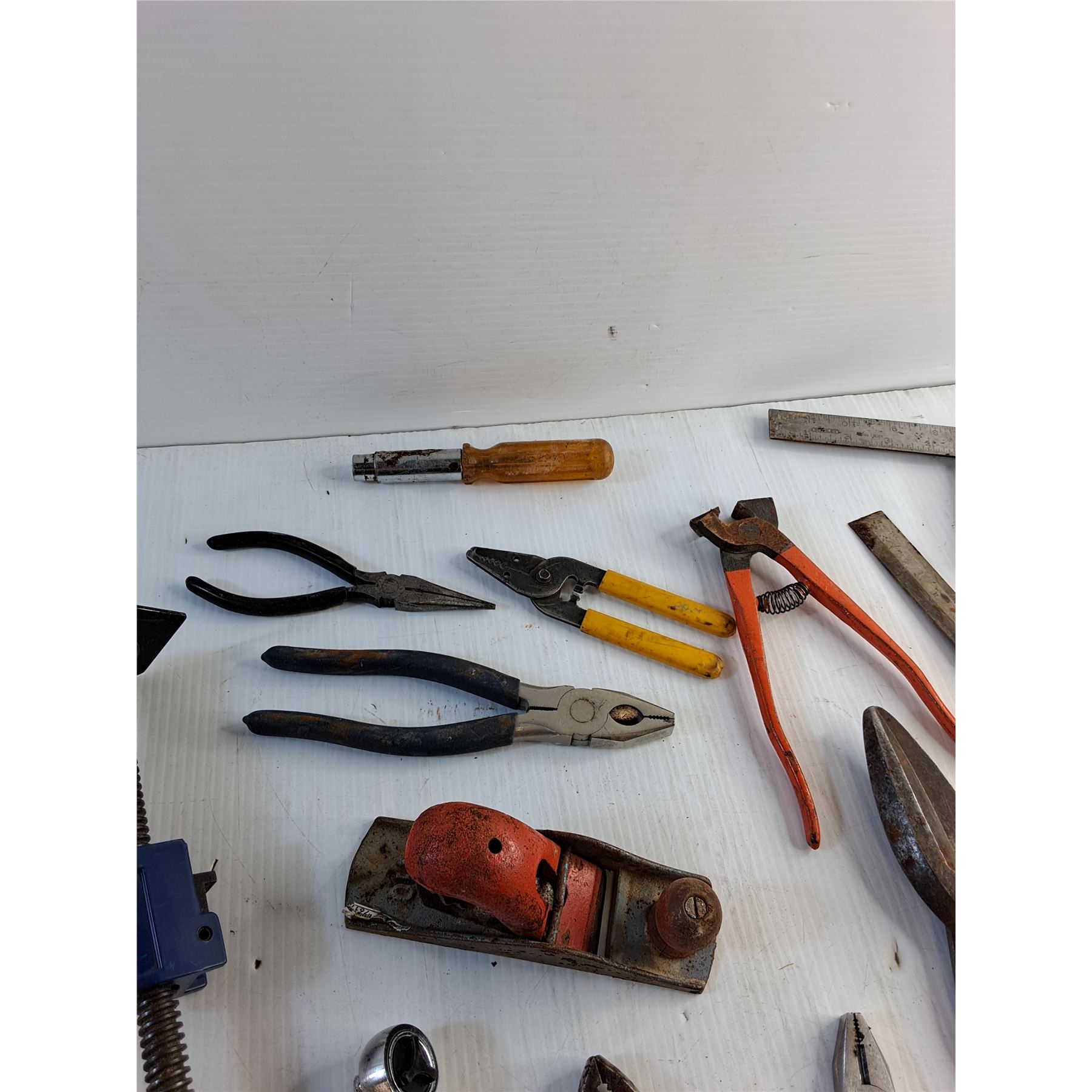 Wood Plane, Pliers, Chisel, Wire Strippers, Ratchet Wrench, Tin Shears, Nail Puller and Misc