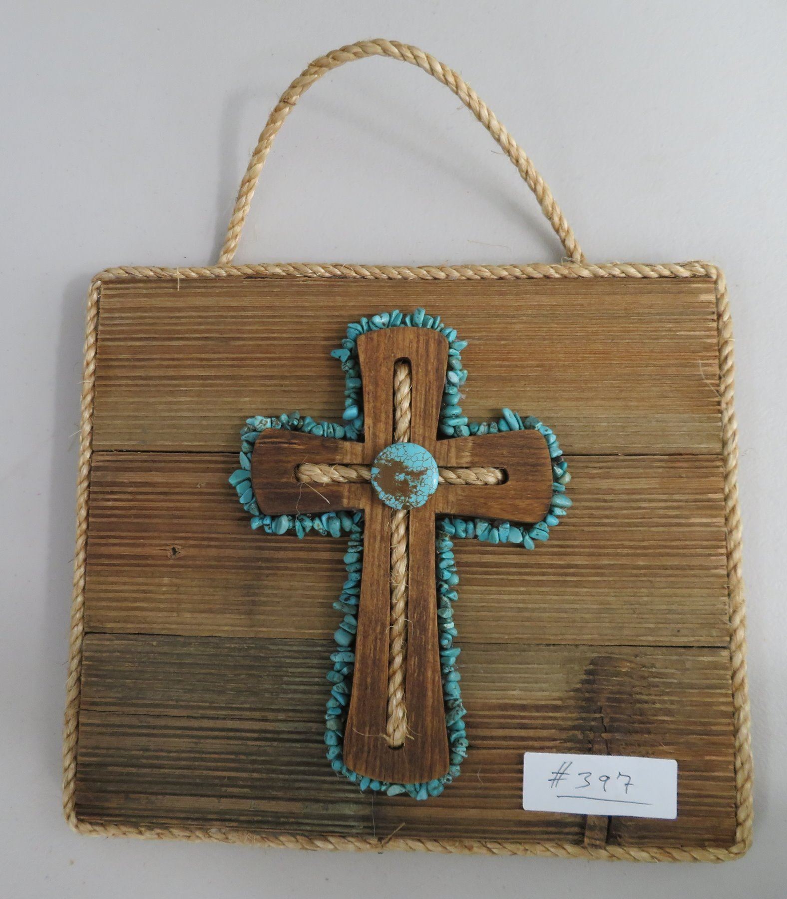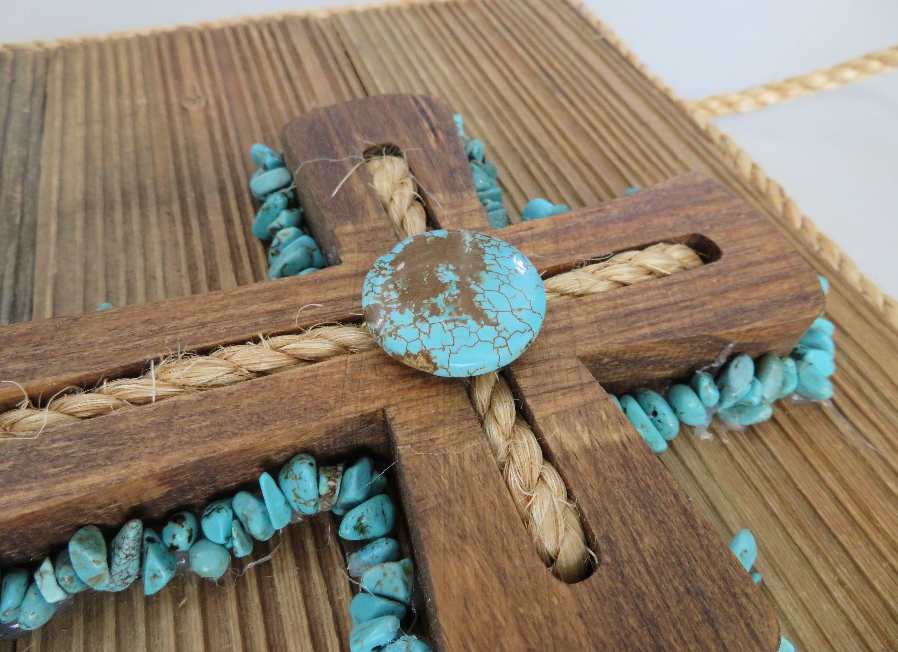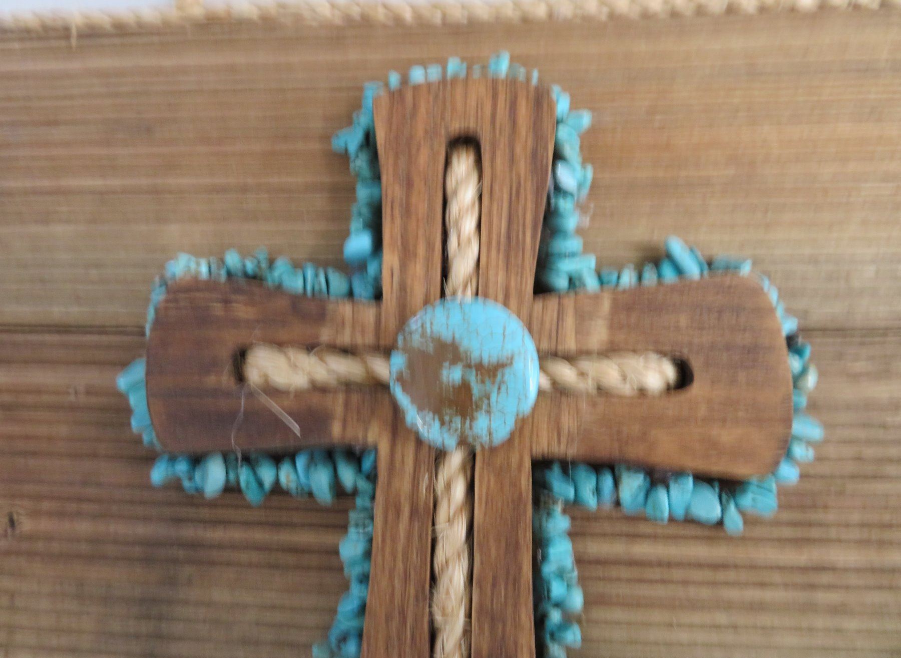 Wood Plaque & Cross, modern item. Made of wood and turquoise, the item measures 12" x 12" x 2". Southwest USA. Plaque with turquoise. Condition: Good, see images. Shipping: $22.50 w/insurance and signature, due to size.