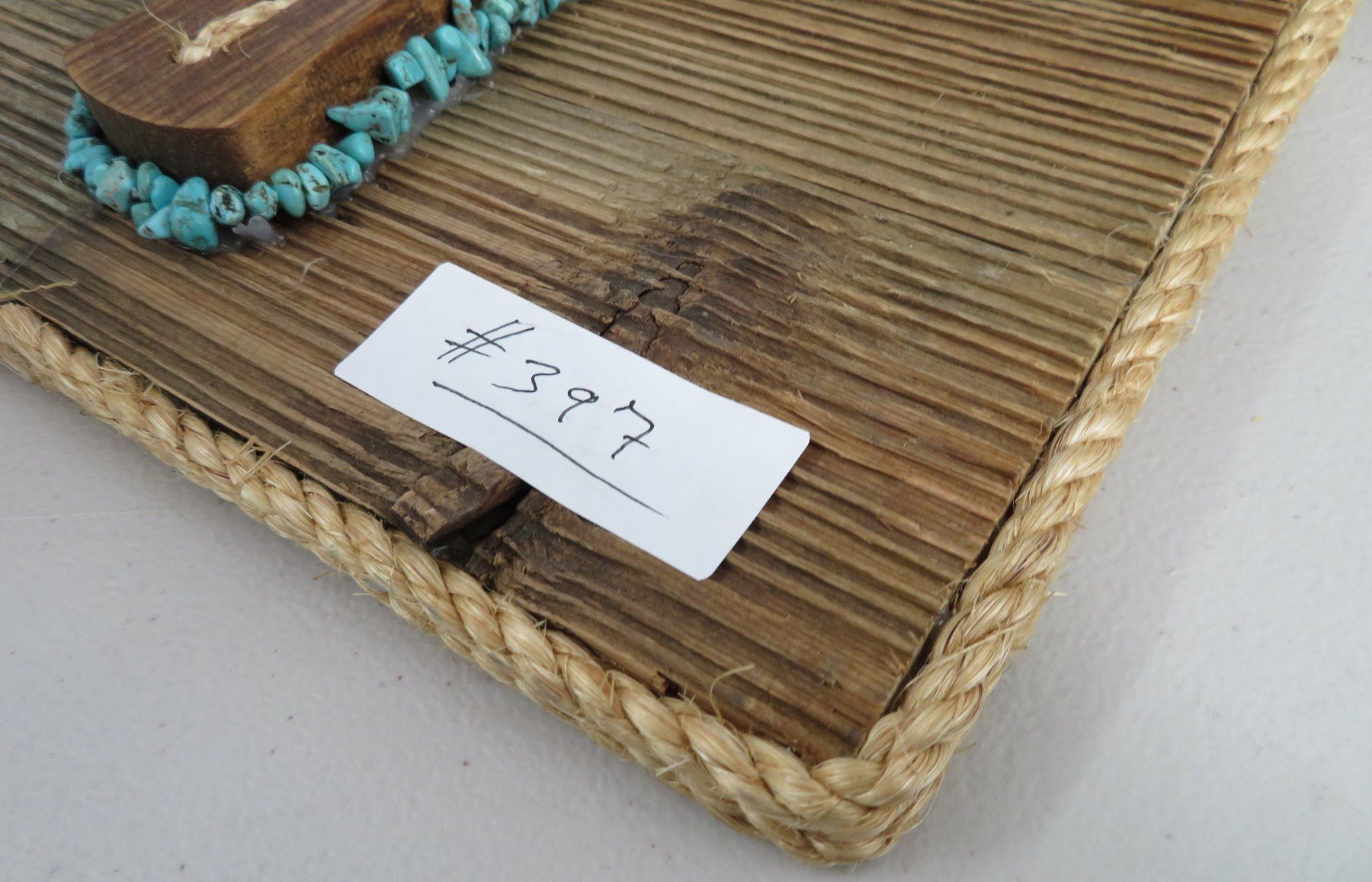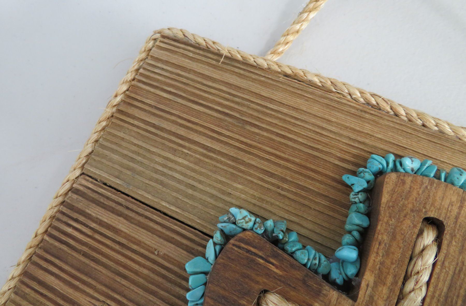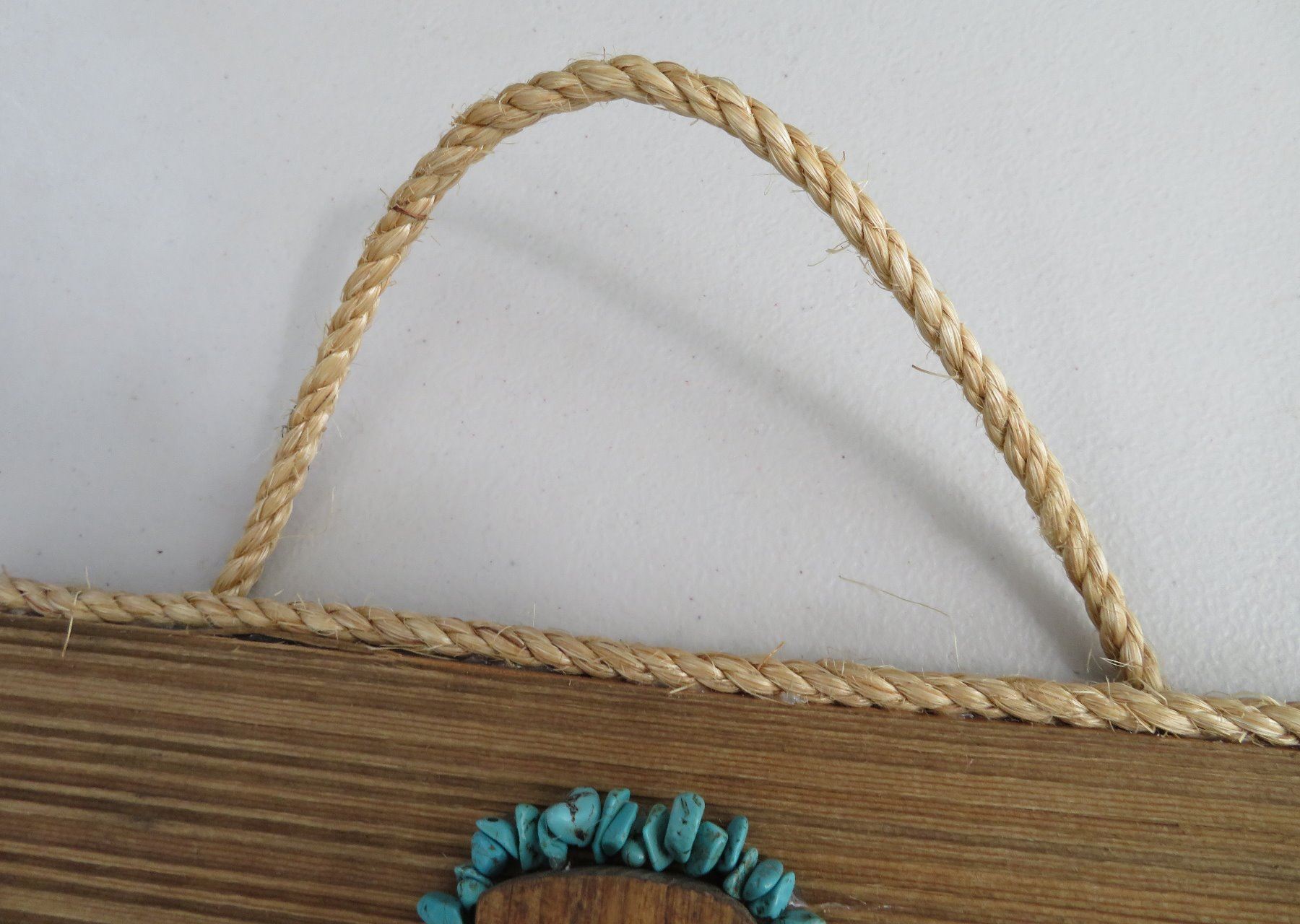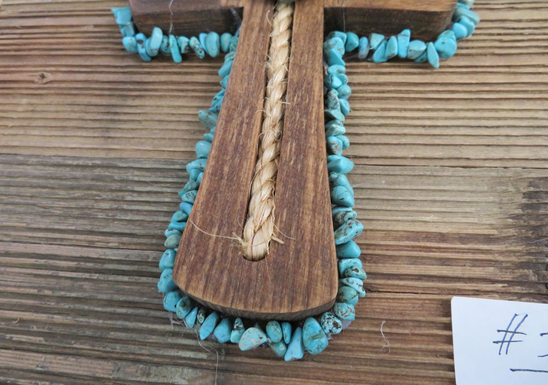 Wood Plaque & Cross, modern item. Made of wood and turquoise, the item measures 12" x 12" x 2". Southwest USA. Plaque with turquoise. Condition: Good, see images. Shipping: $22.50 w/insurance and signature, due to size.