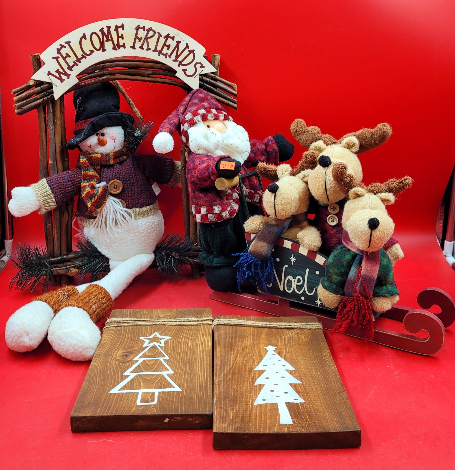 Wood & Plush Decor Lot w/ Reindeer in Sleigh, Snowman, Wooden Christmas Tree Signs, & More