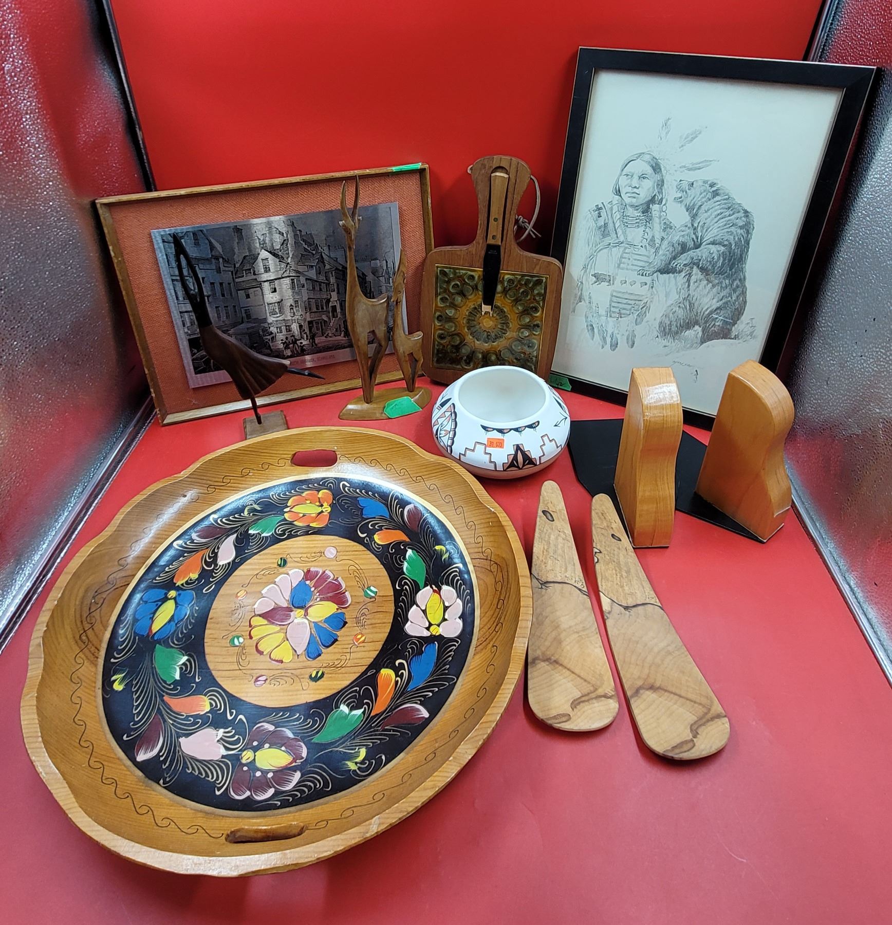 Wood & Print Lot w/ Wooden Serving Tray, Native Print, Wooden Figurines, & More