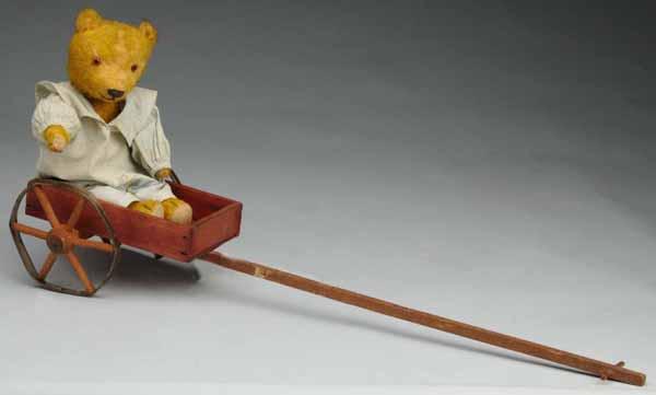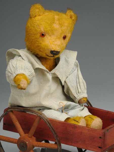 Description Ca. 1920s. Mohair teddy bear with swivel neck, jointed shoulders and hips, sewn nose and claws (some wear), very nice cotton boy’s suit. In a red stained wood two-wheeled pull cart. Condition (Very Good). Size Bear: 13" T.
