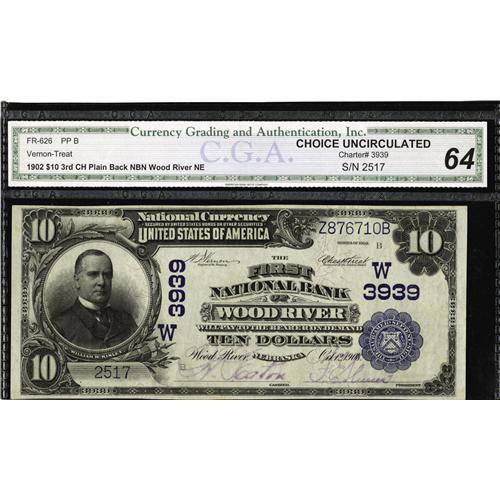 <B>Wood River, NE</B></I> - $10 1902 Plain Back Fr. 626 <B>The First NB</B></I> Ch. # (W)3939<BR>A pretty example from the Wood River hoard. Bright <B>CGA Crisp Uncirculated 64,</B></I> with purple stamp signatures.