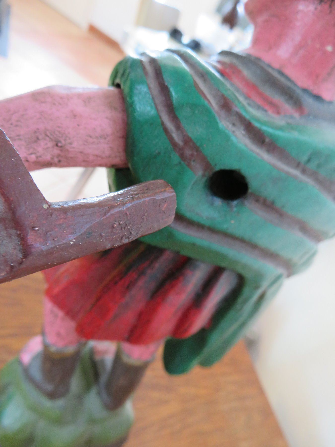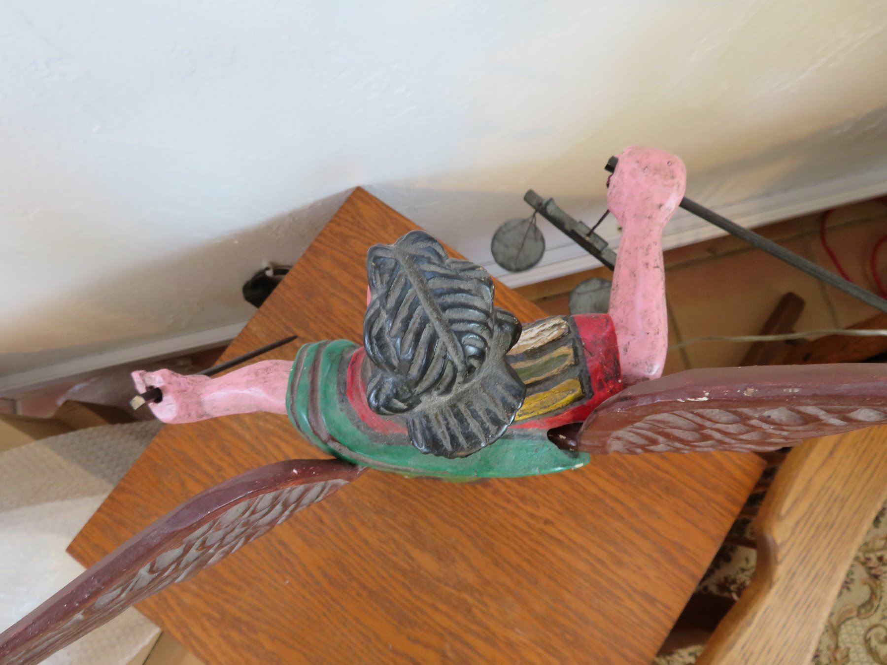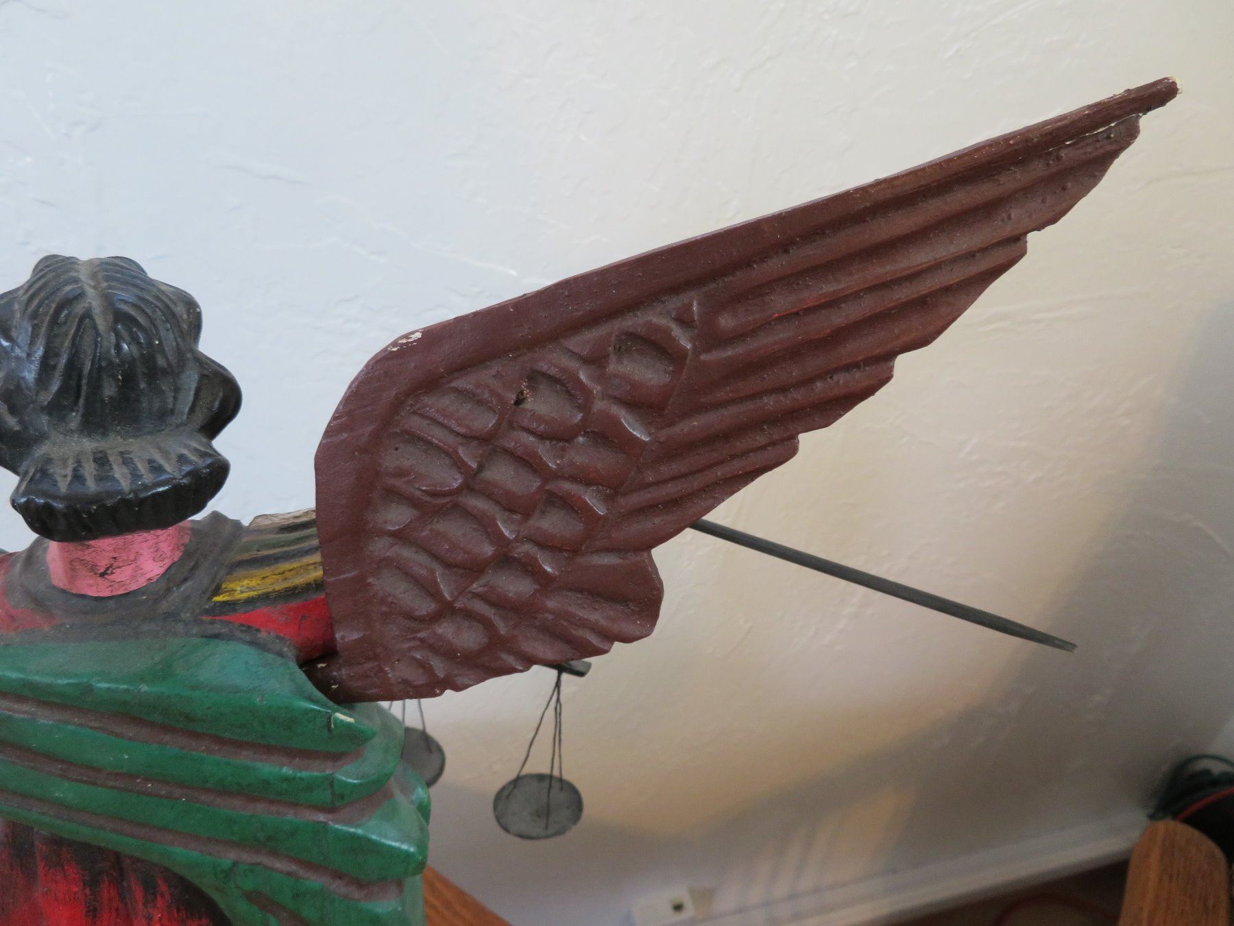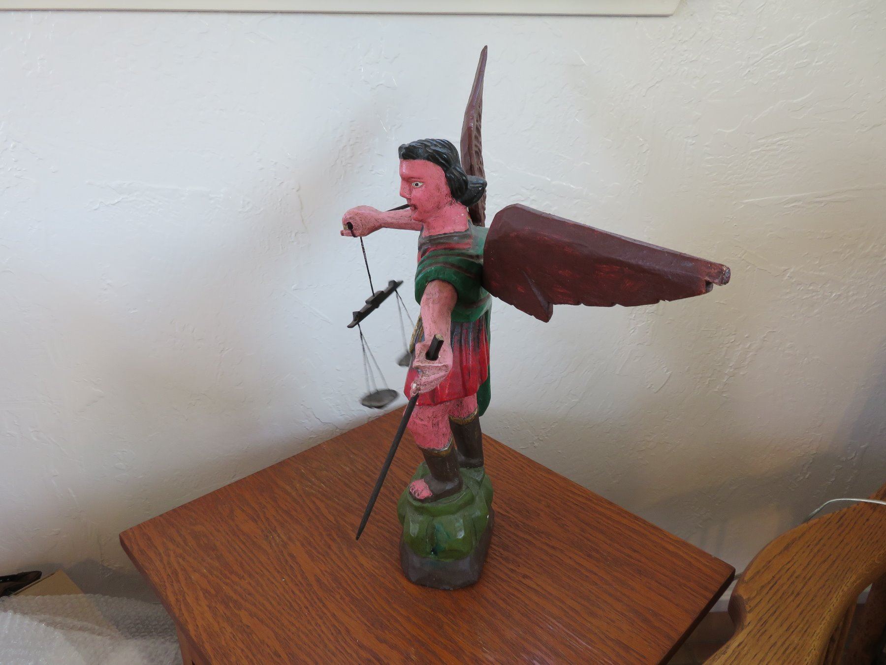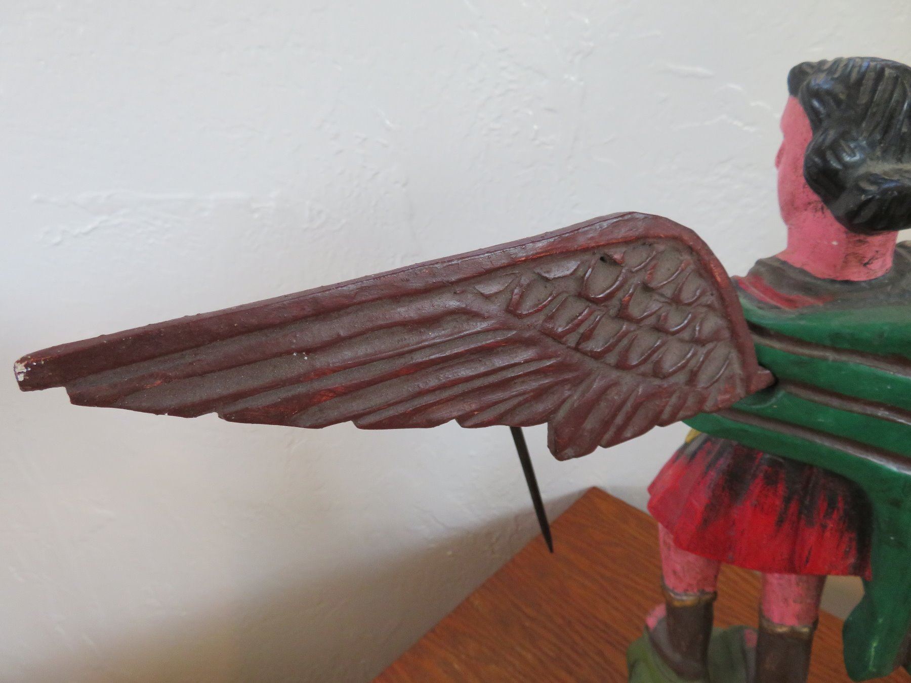 Wood Santo, c. 1930s. Made of wood and paint, the item measures approx. 17" x 20" x 6". Mexico. Wings are removable. Condition: Good, see images. Shipping: $45.00 USA estimate only, w/insurance and signature, due to size.
