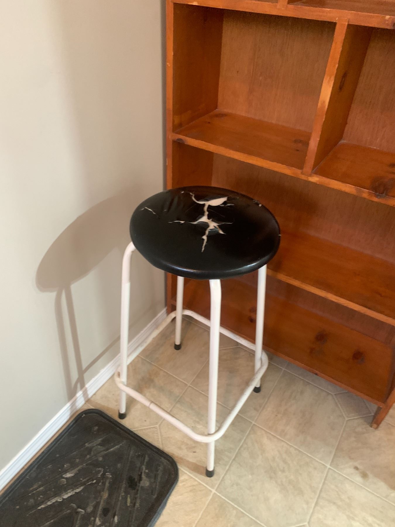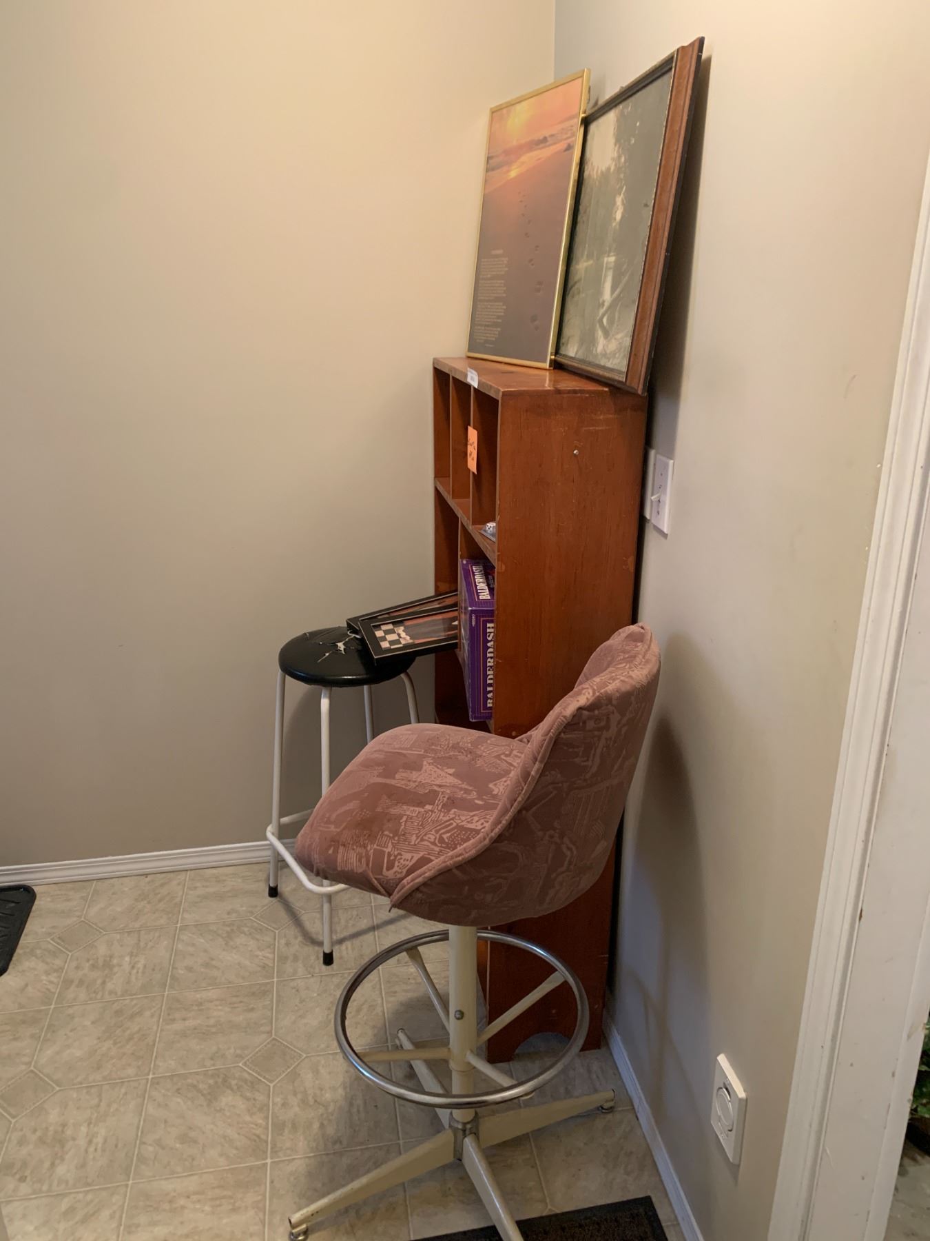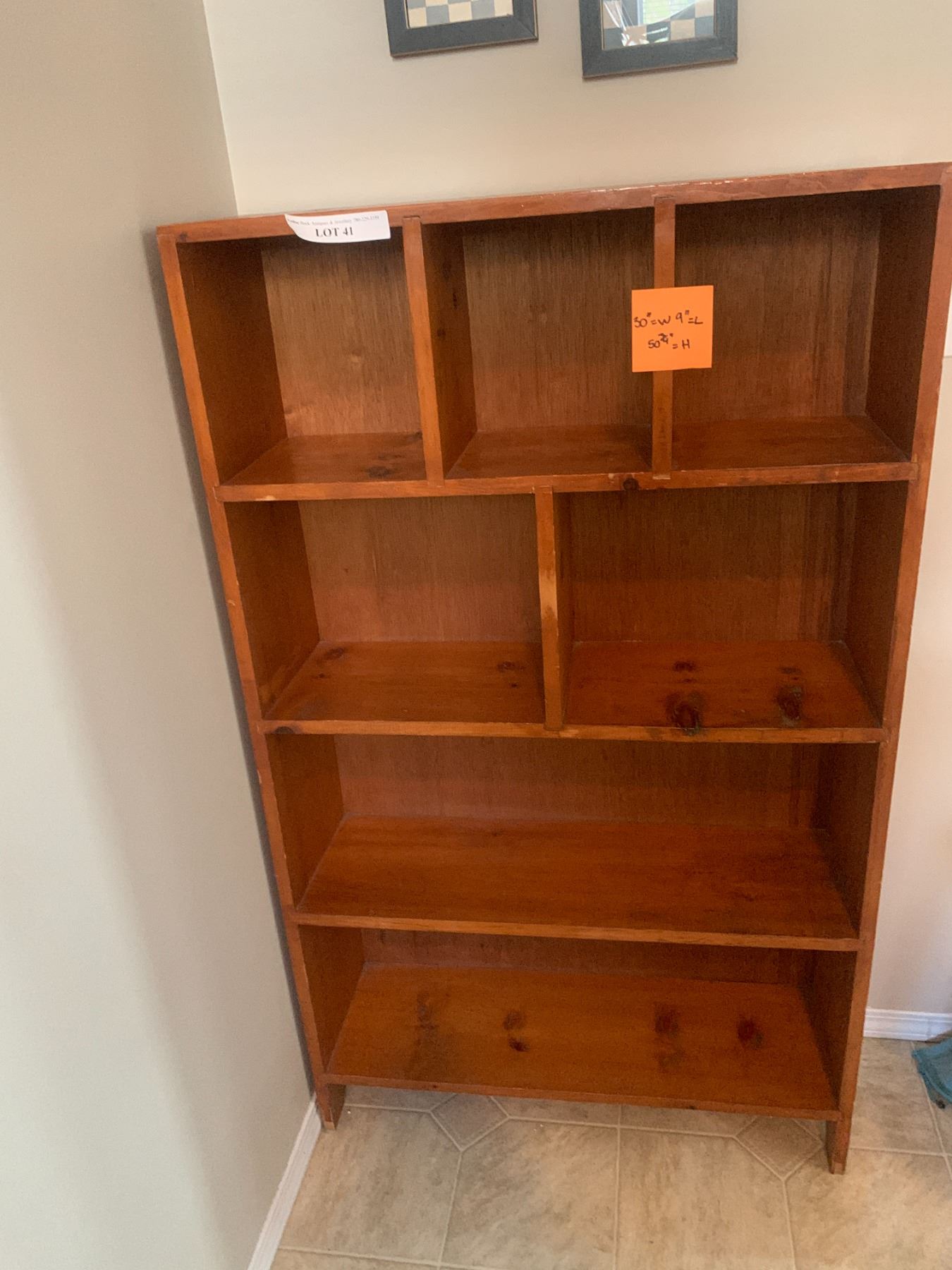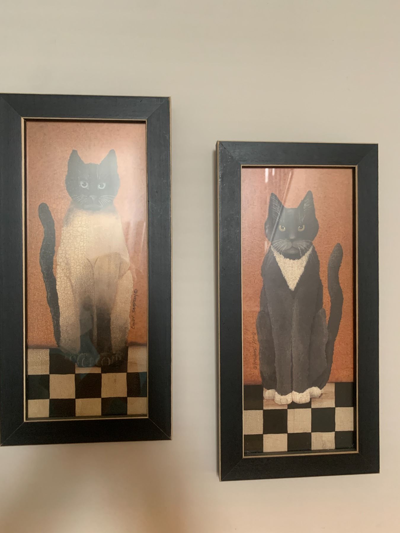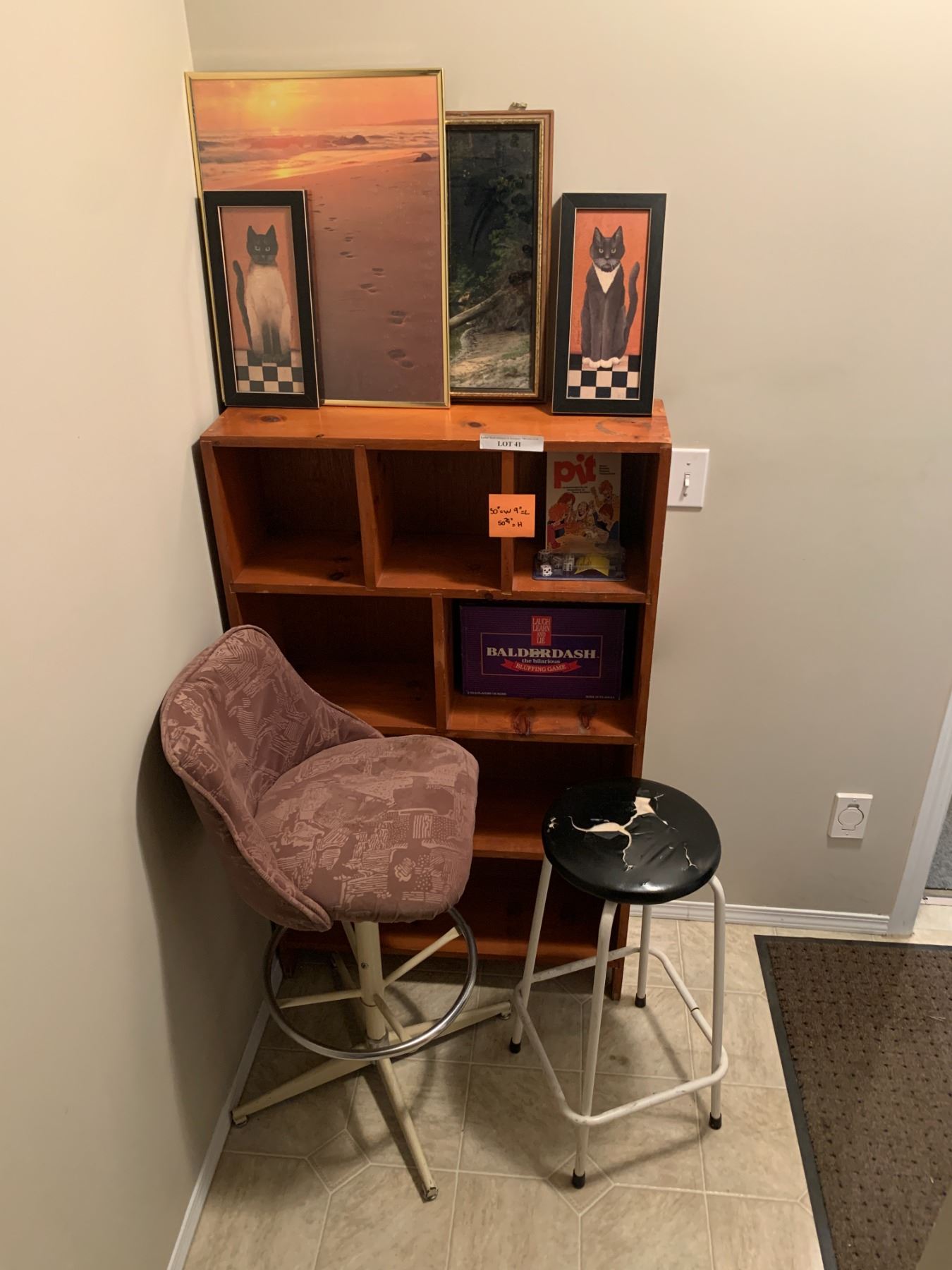 Wood Shelving Unit w Seven Compartment, Two Cat Pictures & Stool (requires reupholster)