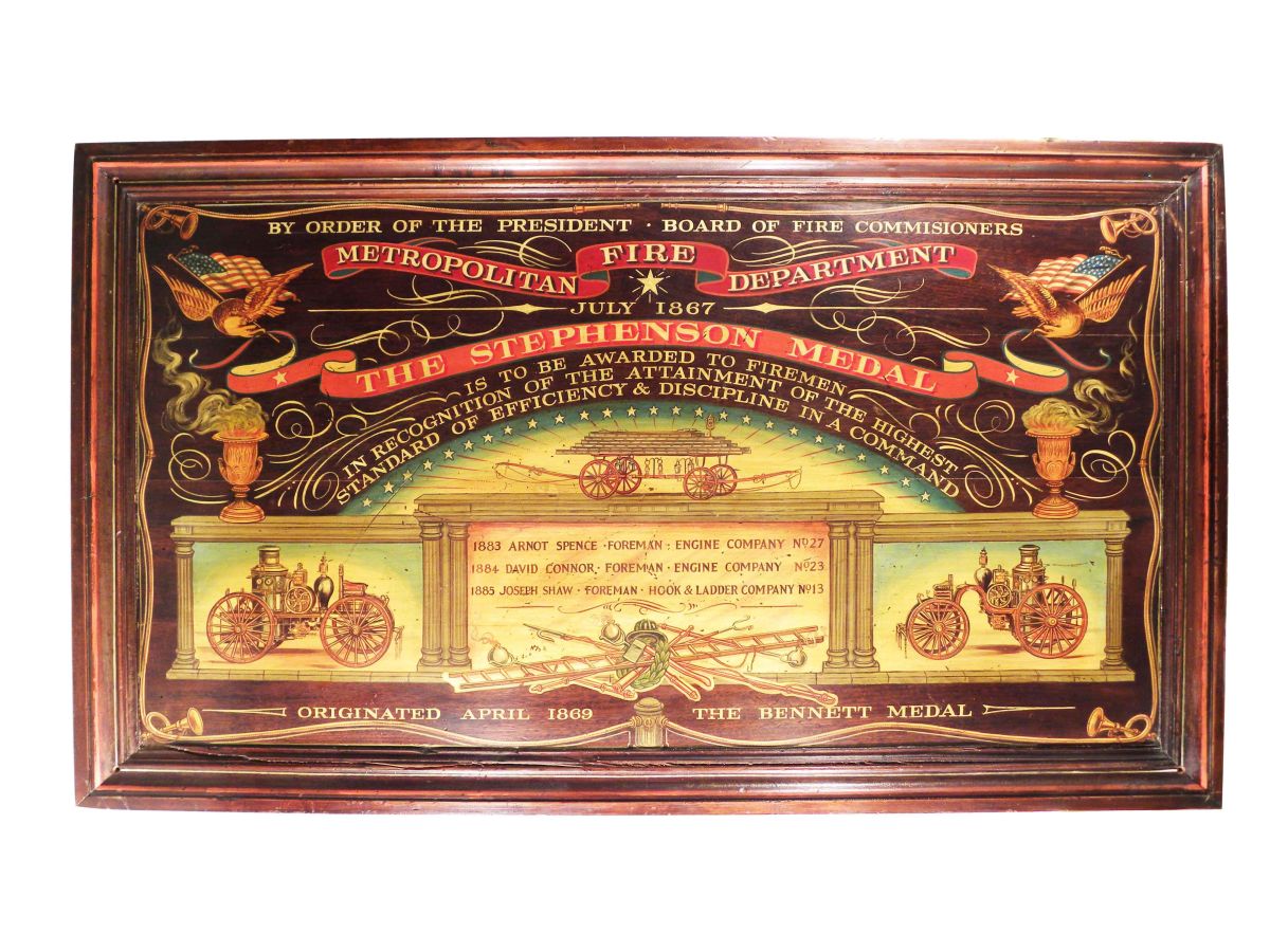 Hand Painted Self Framed Wood Sign for the Metropolitan Fire Department NYC, 1867 Stephenson Medal. Depicts various equipment, eagle and American flags. Excellent condition. 58 X 33 1/2 inches overall.
