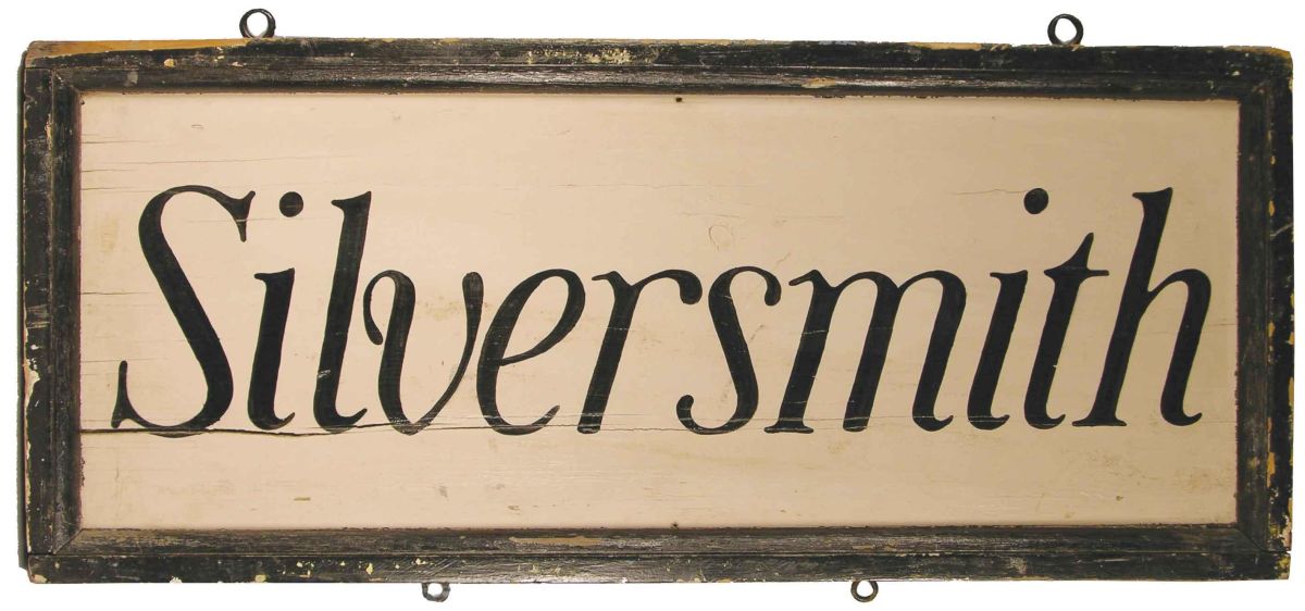 Wood Silversmith Two Sided Sign. Early Repaint. Some paint chips around frame otherwise very good condition. 31 1/2 X 13 1/4 inches.