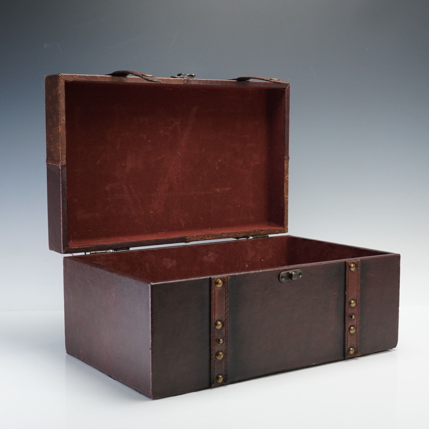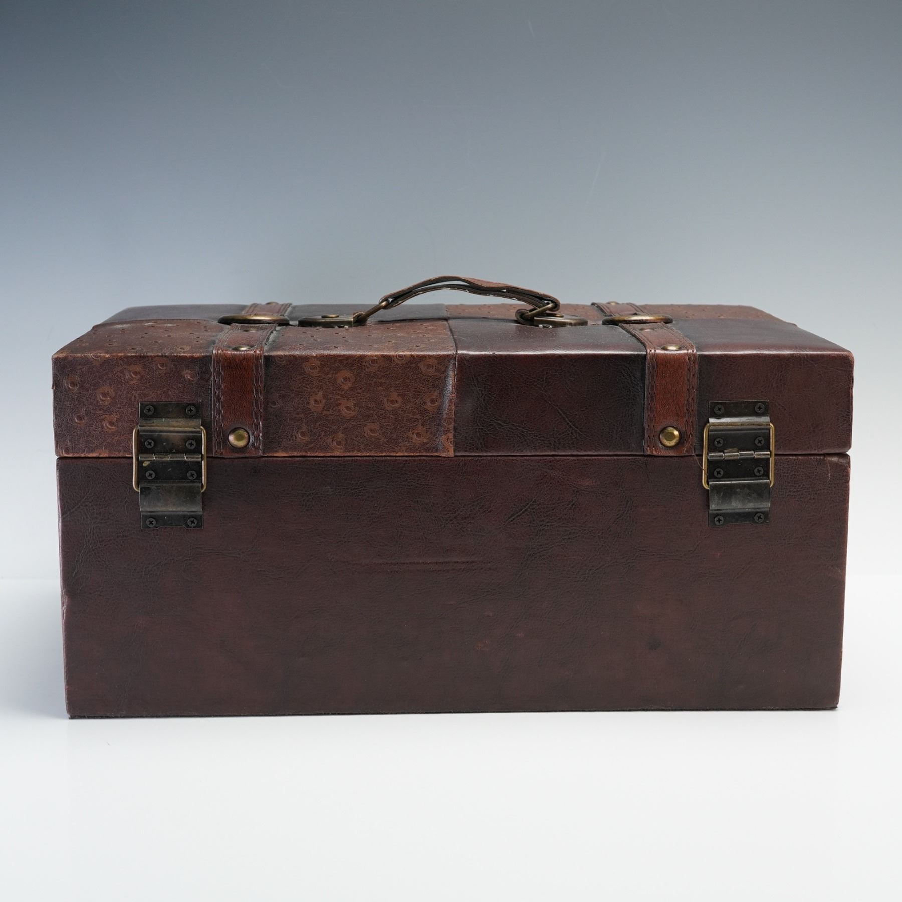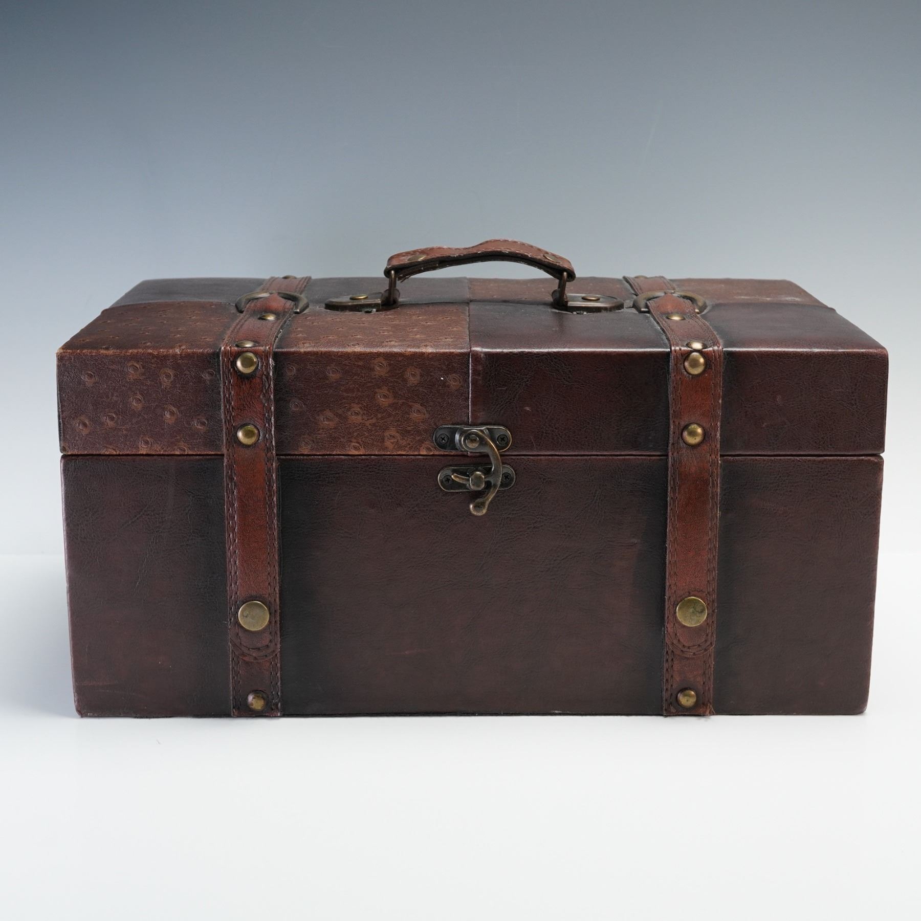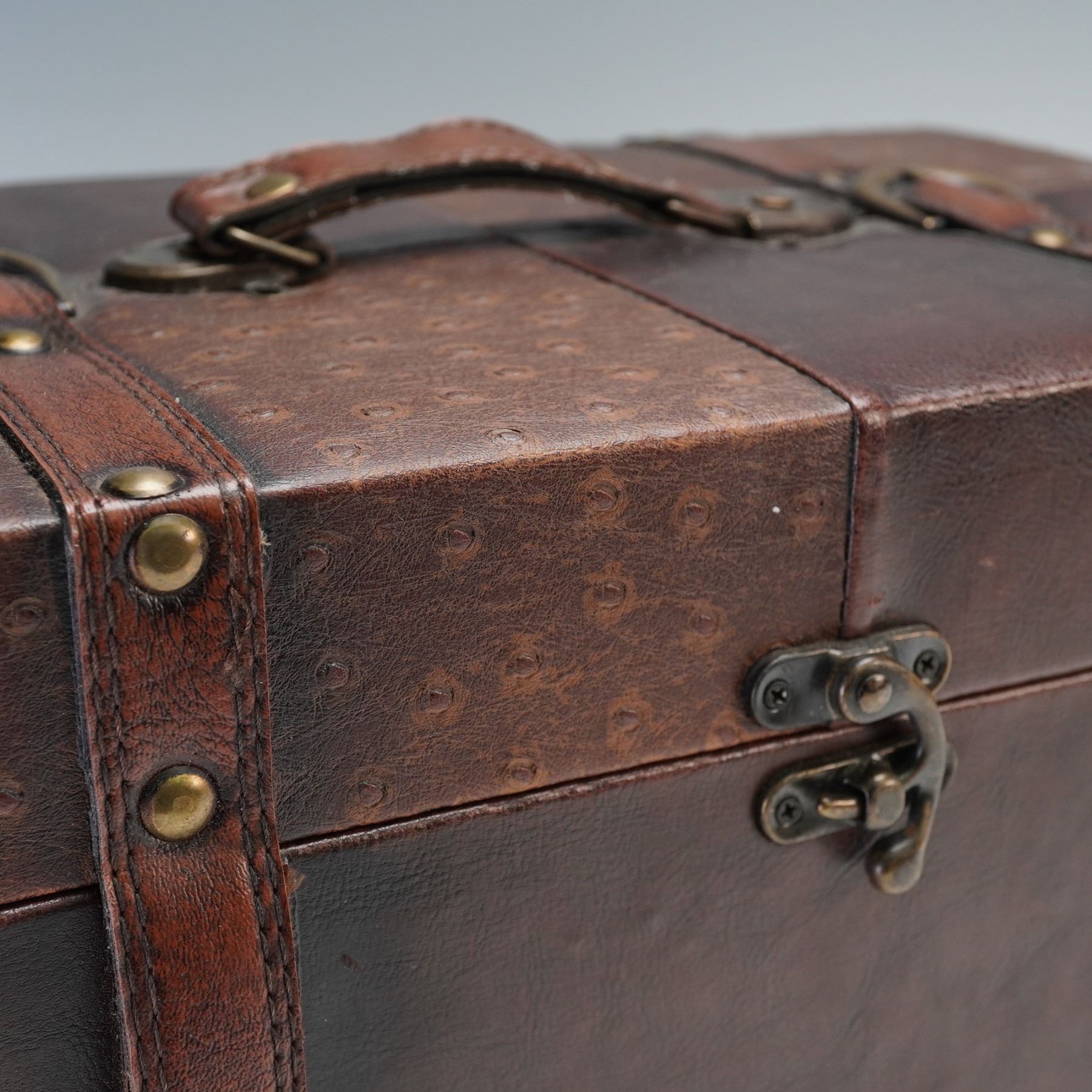 A vintage-style rectangular storage trunk featuring a wood construction wrapped in rich brown leather with embossed ostrich pattern detailing. The trunk includes two decorative leather straps with brass rivets and a latch closure, complemented by a matching leather handle. The interior is lined in soft felt-like material, offering both style and function for decorative or practical use. Hinge-mounted lid opens fully for easy access.