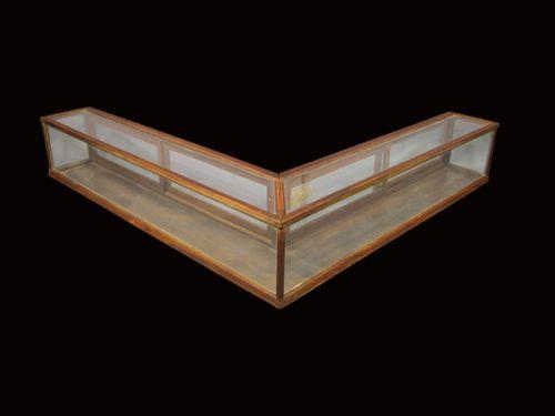 Wood and glass showcase made by the Malinder Co. Waco, TX. Texas Largest Fixture Works-Founder of Quality and Fair Prices. Original tags, excellent original condition. 53 inch each side X 10 X 9.
