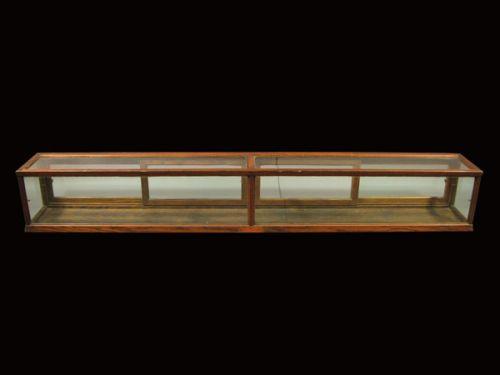 Wood and glass showcase made by the Malinder Co. Waco, TX. Texas Largest Fixture Works-Founder of Quality and Fair Prices. Original tags, excellent original condition. 69 1/2 X 10 X 9 inches.