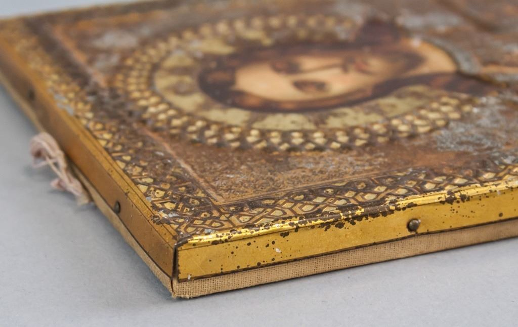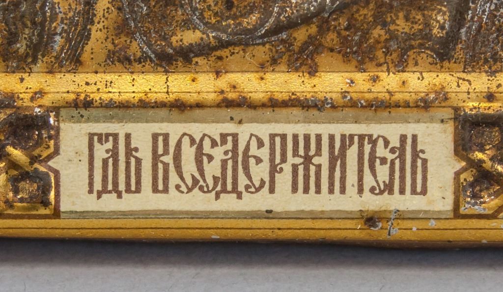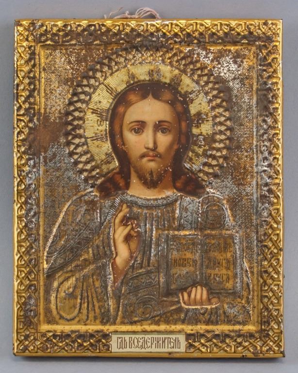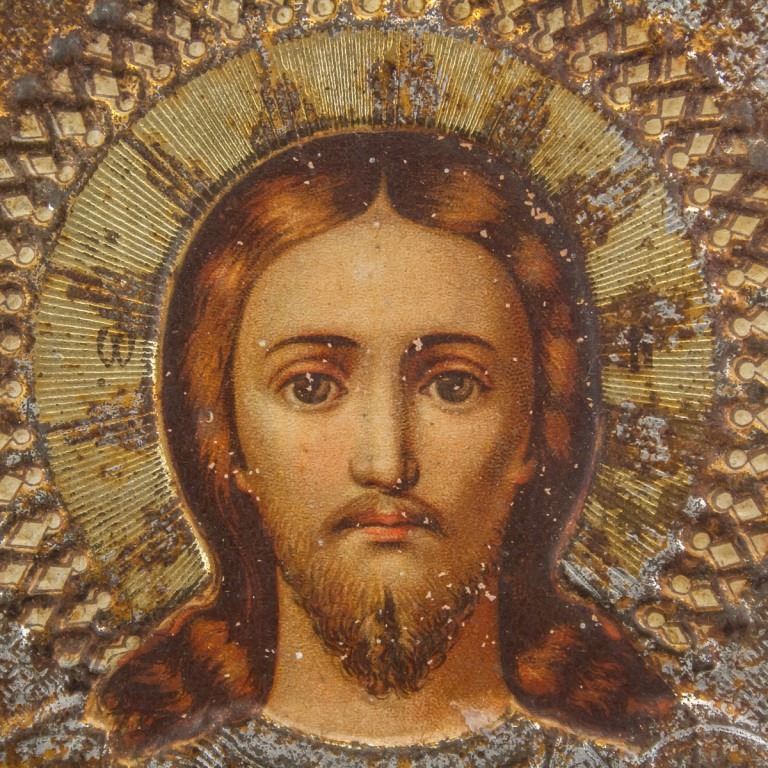 Wood and metal. Etched with image of Christ. "Christ Pantocrator" in Cyrillic to the bottom center. 18 x 14 cm (7 x 5.5 inches).