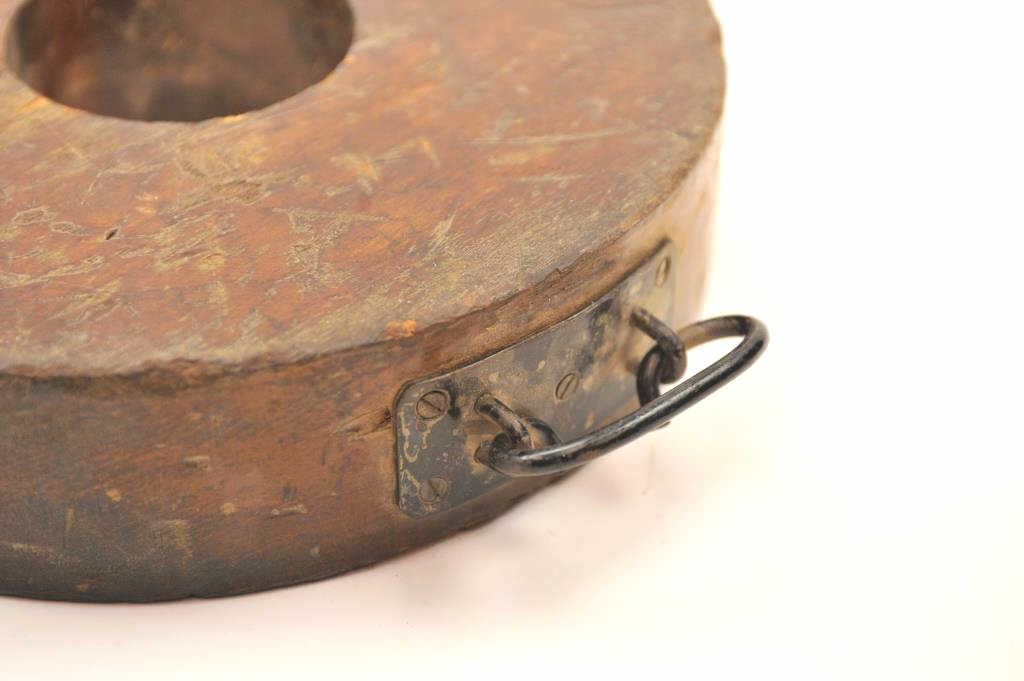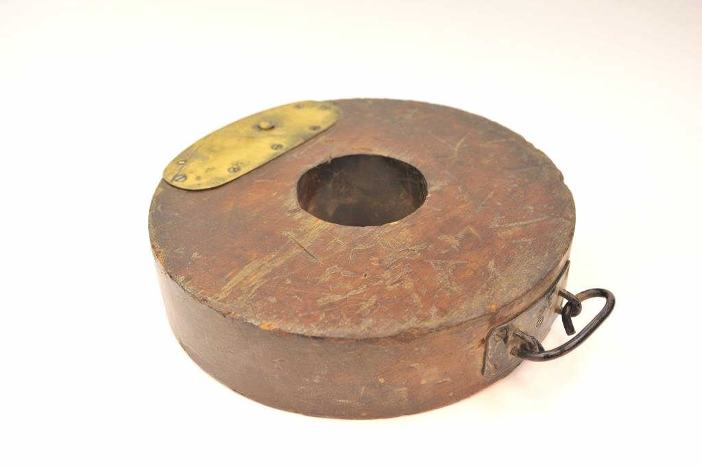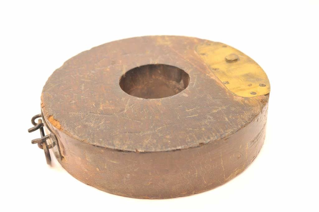 Wood and brass drum for a Gatling gun. The drum is possibly for training, unmarked and antique with arsenal dings, mars and scratches, could also be as storage so as not to stick in the gun on deck or in the field. Est.: $150-$300.