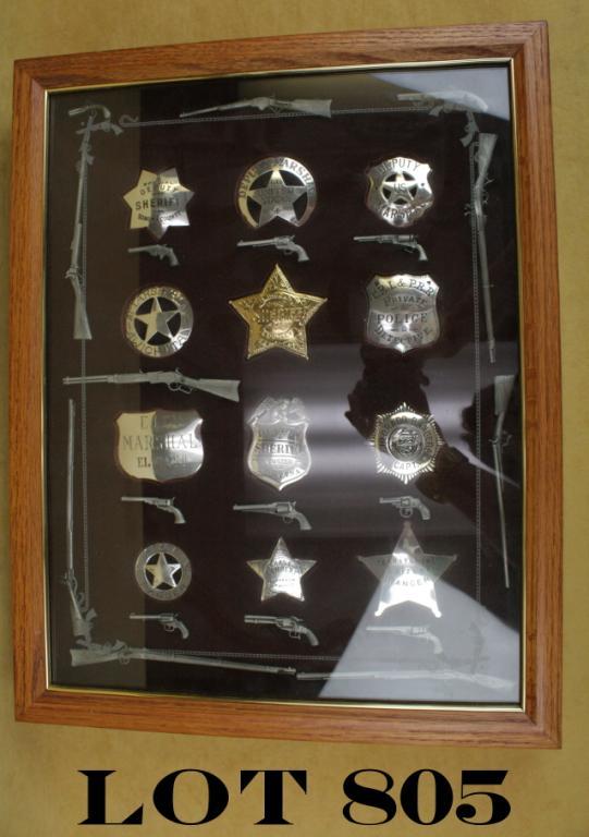 Wood and glass framed shadowbox of 12 reproduction old west badges; the frame being approx. 20” x 16”; the badges include a reproduction of Pat Garrett’s Lincoln County, NM Sheriff’s badge, a copy of DallasStoudenmire’s City Marshal’s badge from El Paso, Texas, a copy of Chris Madsen’s Indian Territory U.S. Deputy Marshal’s badge and representative copies of other police and law enforcement badges, all in very goodcondition. The display also includes miniature metal examples of long arms and handguns including Colts, Remingtons, Sharps, Winchester, etc. Est.: $200-$400.