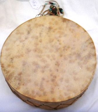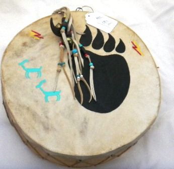 Wood and hide Hopi Drum with painting on front i.e. bear claw and brass bells drops. Condition very good. Shipping $18.00. circa 1950