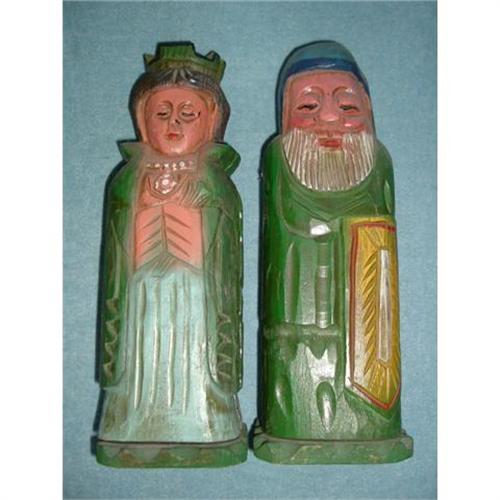 Set of 2 decorative hand-carved wooden containers fashioned to hold 700 ml bottles. The set depicts a medieval king & queen dressed in period robes. 15" x 5" x 5"