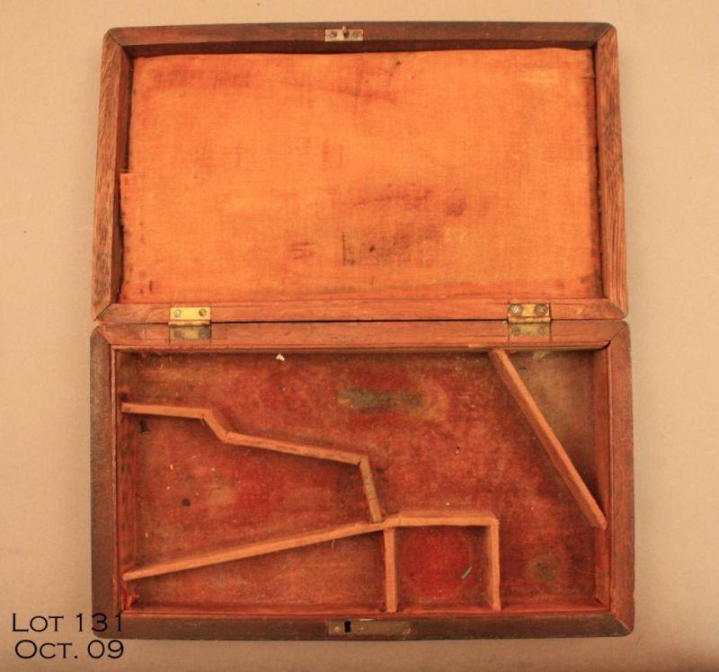 Wood case for a 4” Colt 1849 Pocket percussion revolver, in overall good condition showing interior compartments and lining with some areas of impression from a gun laying in the box, some slight fraying where the front sight rests in thebox and an exterior of the box that is overall good with an old refinish of the top section of the lid. Est.: $1,250-$2,500.