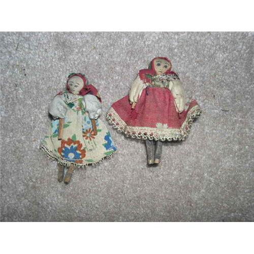 Cute little pair of 2.5" wooden dolls. Arms and legs move. I can't tell how they are put together as their clothing is sewn on. Looks like the faces are a piece of cloth with ink features. I don't know anything about them. Dolls are from a smoke free environment. Buyer to pay $6 for shipping, insurance and handling. Thanks for viewing.