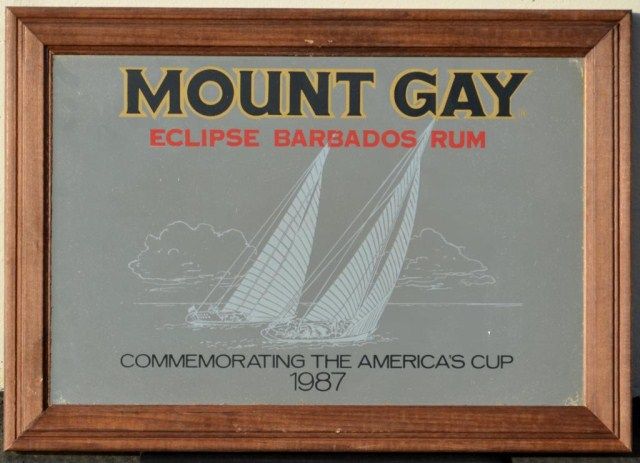 Wood framed bar mirror advertiser commemorating the America’s Cup 1987 for Mount Gay Eclipse Barbados Rum, approx. 15” x 21” in very good condition. Est.: $50-$75.