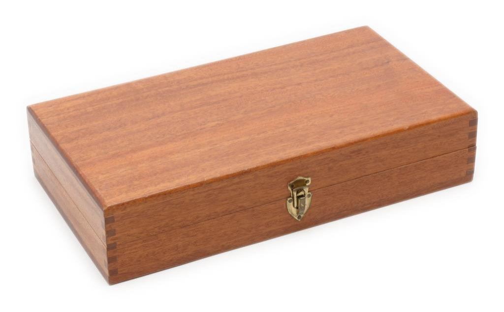 Wood presentation case for a revolver or pistol, approx. 14” x 8” x 3” with velveteen lining in overall fine condition. Est.: $35-$55.