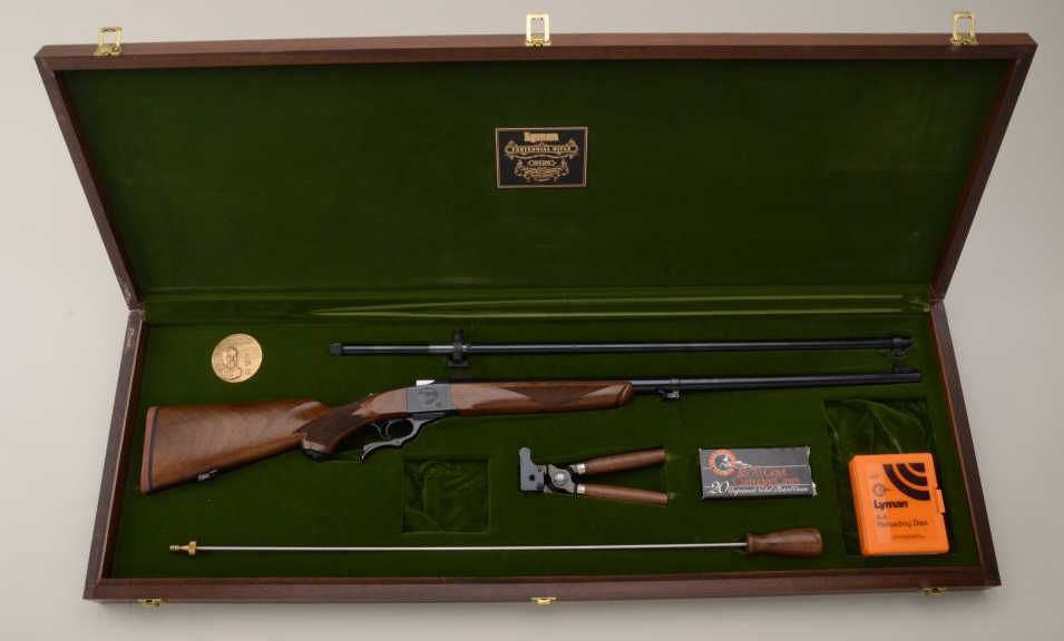 Wood presentation cased Lyman single shot Centennial Model rifle by Ruger (No 1 Model), .45-70 cal., 28” heavy round barrel, sling swivels, checkered wood stocks, #132-07313/L-78-0717. This gun is in overallfine condition showing the majority of its original finish, very good + bore with a small area of erosion visible, crisp action and markings, fine wood stocks, scope mounts; case is overall very good to fine with thefollowing accessories: Lyman tube scope with fine optics; bullet mold; Lyman re-loading dies; cleaning rod and box of 20 .45-70 Unprimed, nickel plated cases; accompanied by scope operating instructions, bullet makingguide and other misc. info sheets. Est.: $1,250-$2,500.