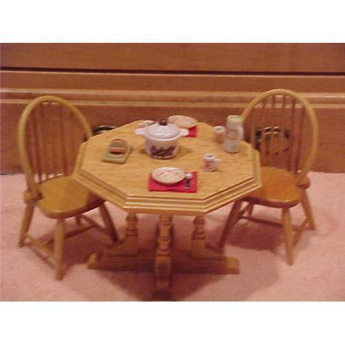 These three pieces of doll house furniture are made of wood. The table is set for breakfast and has a loaf of bread, coffee pot, 3 cups, 2 plates with spoons and a bowl with lid on it. They are all stuck to the table. There are no markings so I can't name maker or country. Constructed well and in wonderful condition. Be perfect in a doll setting or doll house. I see evidence of sticker tags on the bottoms. My little 3 and 4" bisque dolls look adorable sitting in the chairs. Really attractive pieces with no damage.