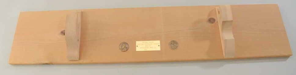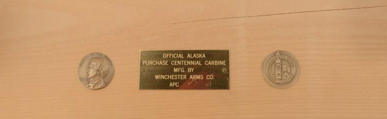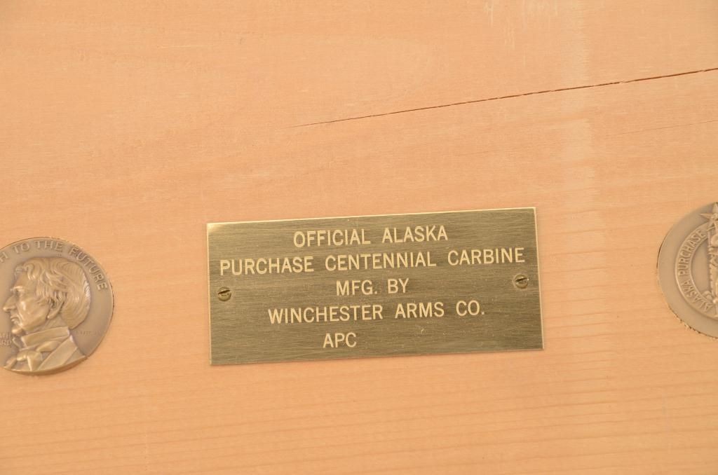 Wood wall display with plaque engraved "Official Alaska Purchase Centennial Carbine - Manufactured by Winchester Repeating Arms Co. A.P.C." with two inlaid Alaskan motif medallions. Plaque very good with slightaging crack. Displays any '94 carbine. 42 1/2" x 9". Est. $40-80.