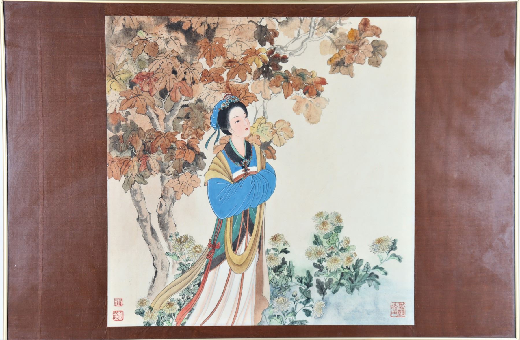 Delicate image of a beautiful girl in a natural setting, signed with chop marks, framed.