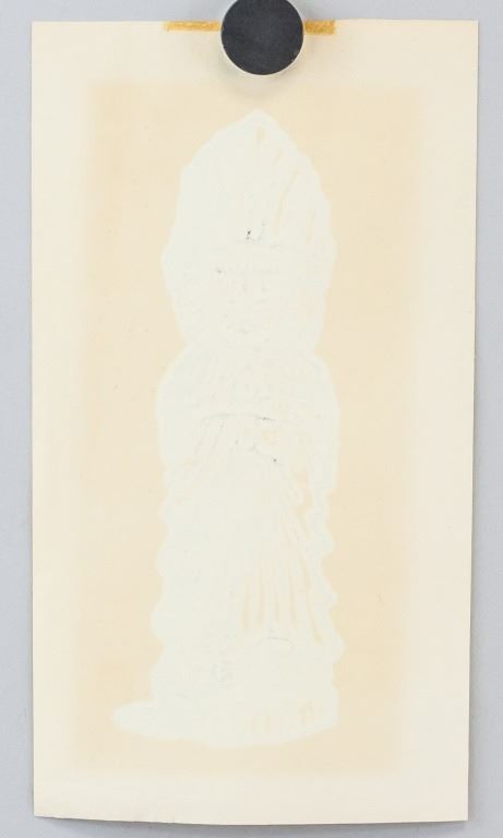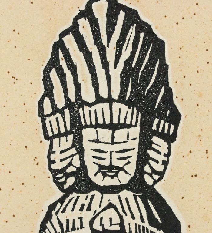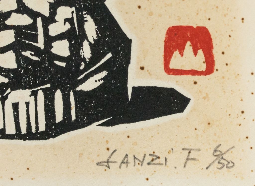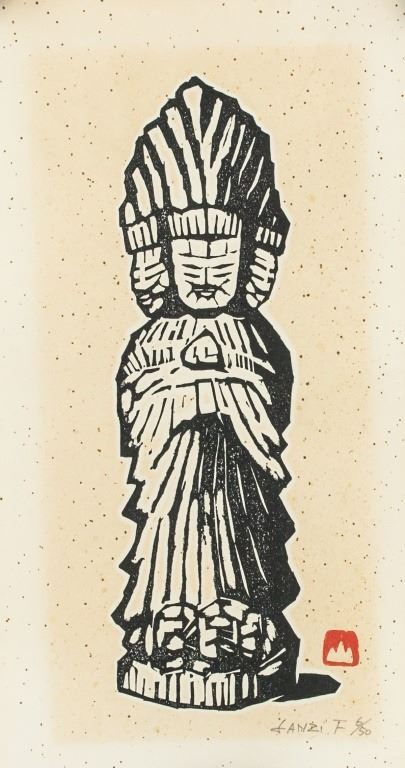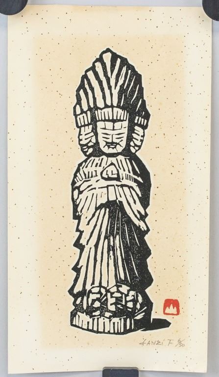 Woodblock print on paper. Featuring image of carved statue. Inscribed with mountain seal to the bottom right. Signed "San Zi" to the bottom right corner. "F 6/50" inscribed beside the signature. 24.5 x 13 cm. Provenance: Private collection, Philippines