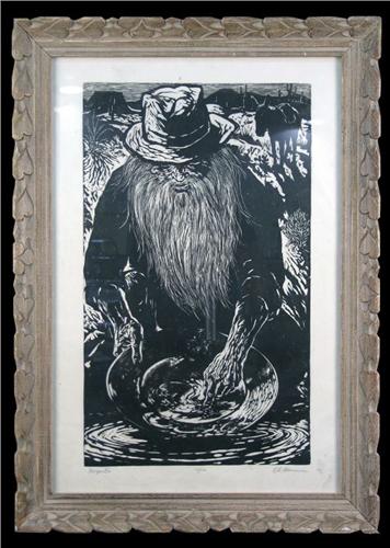 Woodcut, print of a prospector panning for gold artist Ed Hanson