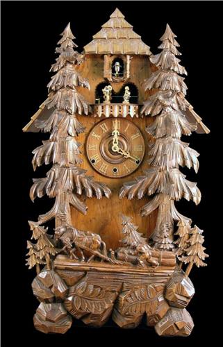 Woodcutter Clock made in Germany. 8 day mechanical wind-up movement with two musical tunes which play to the dance of the turning figures. Large 30"