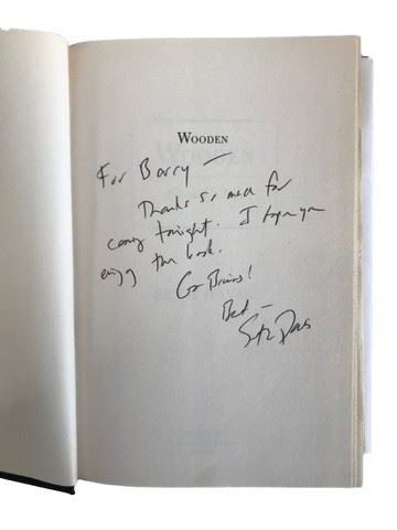 Times Books hardcover first edition of "Wooden: A Coach’s Life by Seth Davis". This copy features Wooden in gold foil lettering on the spine, deckled edge pages and high quality dust jacket featuring an image of John Wooden. Personally signed "for Barry, thank you for coming tonight. I hope you enjoy the book. Go Bruins! Best - Seth Davis"