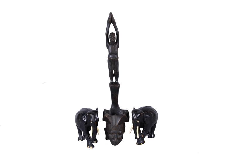 Wooden African Carvings 2 are elephants with pre-ban ivory tusks and 1 figural carving. Total of 3 pieces.2 are elephants with pre-ban ivory tusks and 1 figural carving. Total of 3 pieces.