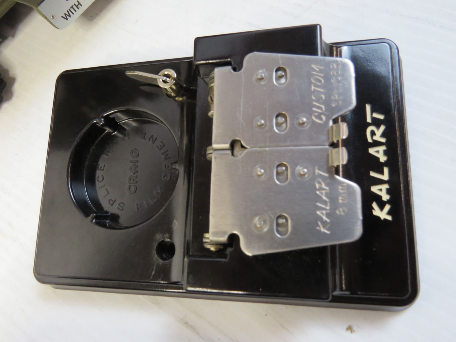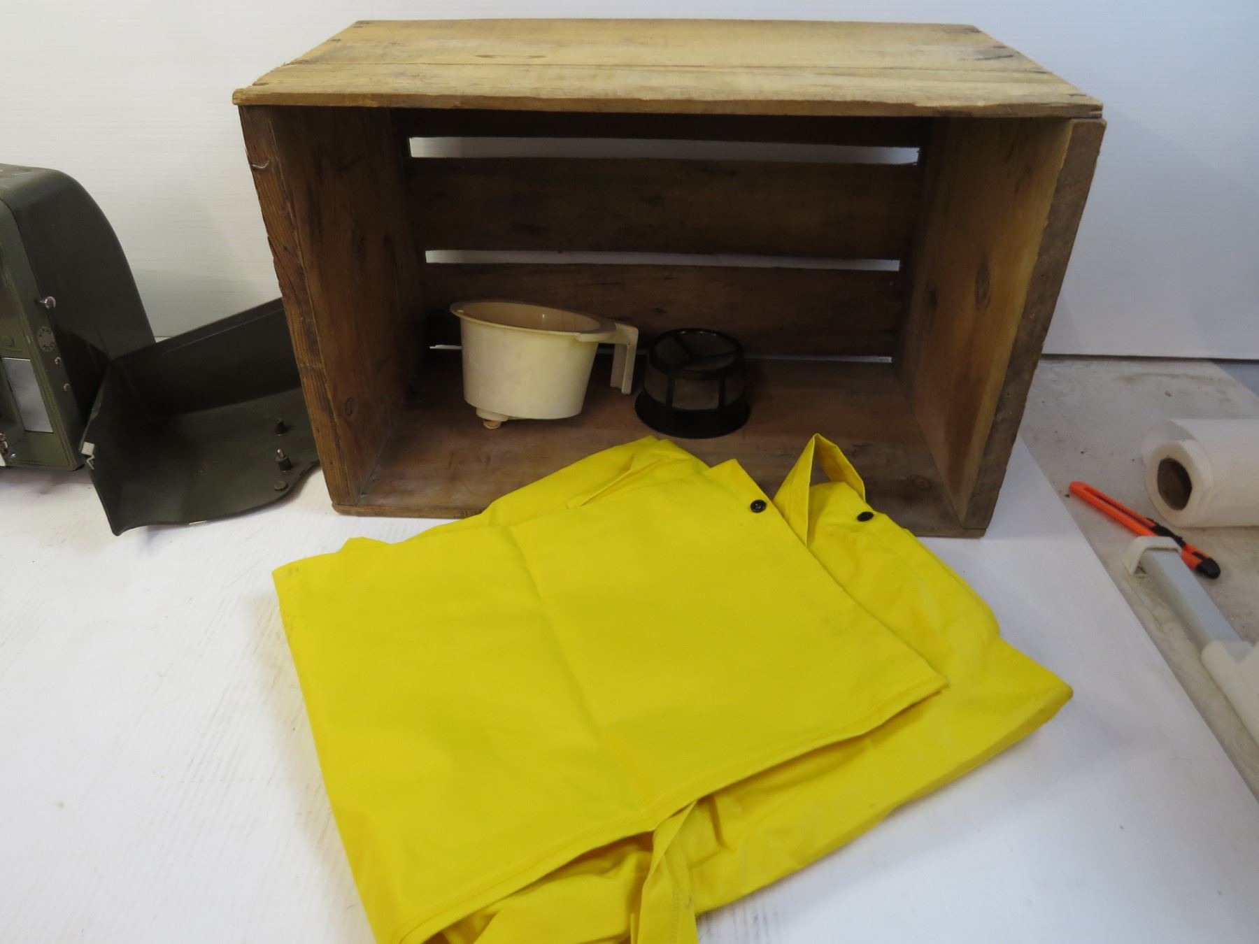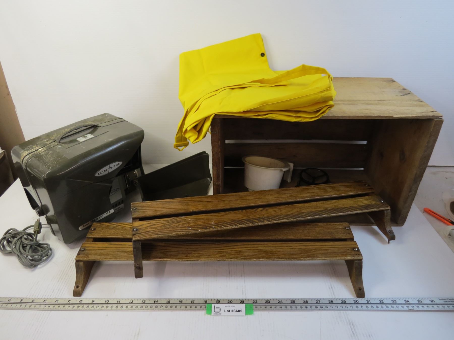 Wooden Apple Crate - Rain Coveralls - (2) Spice Shelves - Kalart Projector (cover broken - working)
