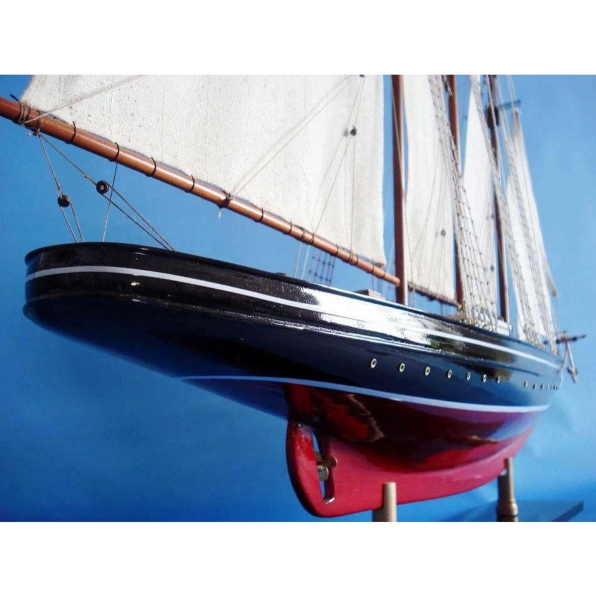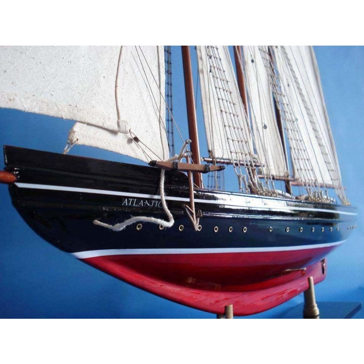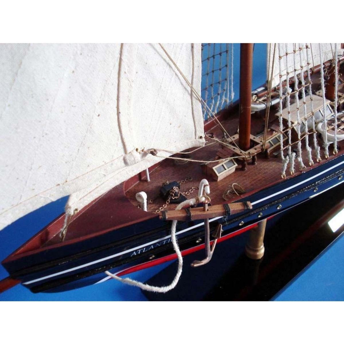 Wooden Atlantic Limited Model Sailboat 32" SOLD FULLY ASSEMBLED Ready for Immediate Display - Not a Model Ship kit Fine craftsmanship and exquisite details are the hallmarks of this Limited Edition replica racing yacht model of the famous Atlanticschooner. Proudly displayed upon a shelf or mantle, the museum-quality features of these Atlantic model yachts are certain to make them the highlight and conversation-piece of any room. 32" Long x 6" Wide x 26" High (1:85 scale) Accurate museum-quality scale replica of the real Atlantic racing yacht Fully assembled model yachts with all masts, sails and rigging already secure and taut Individual plank on frame construction of the hull using fine quality woods, with each plank and wood grain visible through the paint High quality Craftsmanship and Details, including: Four accurate lifeboats with oars tied-down to deck Significantly increased rigging with greater detail and accuracy Metal anchors with wooden crossbars Four flags and racing pennants fly from the masts and rigging Limited production run only 50 of this model sailing ship Certificate of Authenticity individually numbered and signed by HMS Founder and Master Builder Richard Norris Significant research to guarantee accuracy of our sailing ship models includes sources such as photos, historical plans and original artwork.