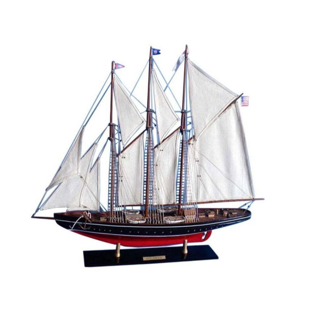 Wooden Atlantic Limited Model Sailboat 32" SOLD FULLY ASSEMBLED Ready for Immediate Display - Not a Model Ship kit Fine craftsmanship and exquisite details are the hallmarks of this Limited Edition replica racing yacht model of the famous Atlanticschooner. Proudly displayed upon a shelf or mantle, the museum-quality features of these Atlantic model yachts are certain to make them the highlight and conversation-piece of any room. 32" Long x 6" Wide x 26" High (1:85 scale) Accurate museum-quality scale replica of the real Atlantic racing yacht Fully assembled model yachts with all masts, sails and rigging already secure and taut Individual plank on frame construction of the hull using fine quality woods, with each plank and wood grain visible through the paint High quality Craftsmanship and Details, including: Four accurate lifeboats with oars tied-down to deck Significantly increased rigging with greater detail and accuracy Metal anchors with wooden crossbars Four flags and racing pennants fly from the masts and rigging Limited production run only 50 of this model sailing ship Certificate of Authenticity individually numbered and signed by HMS Founder and Master Builder Richard Norris Significant research to guarantee accuracy of our sailing ship models includes sources such as photos, historical plans and original artwork.