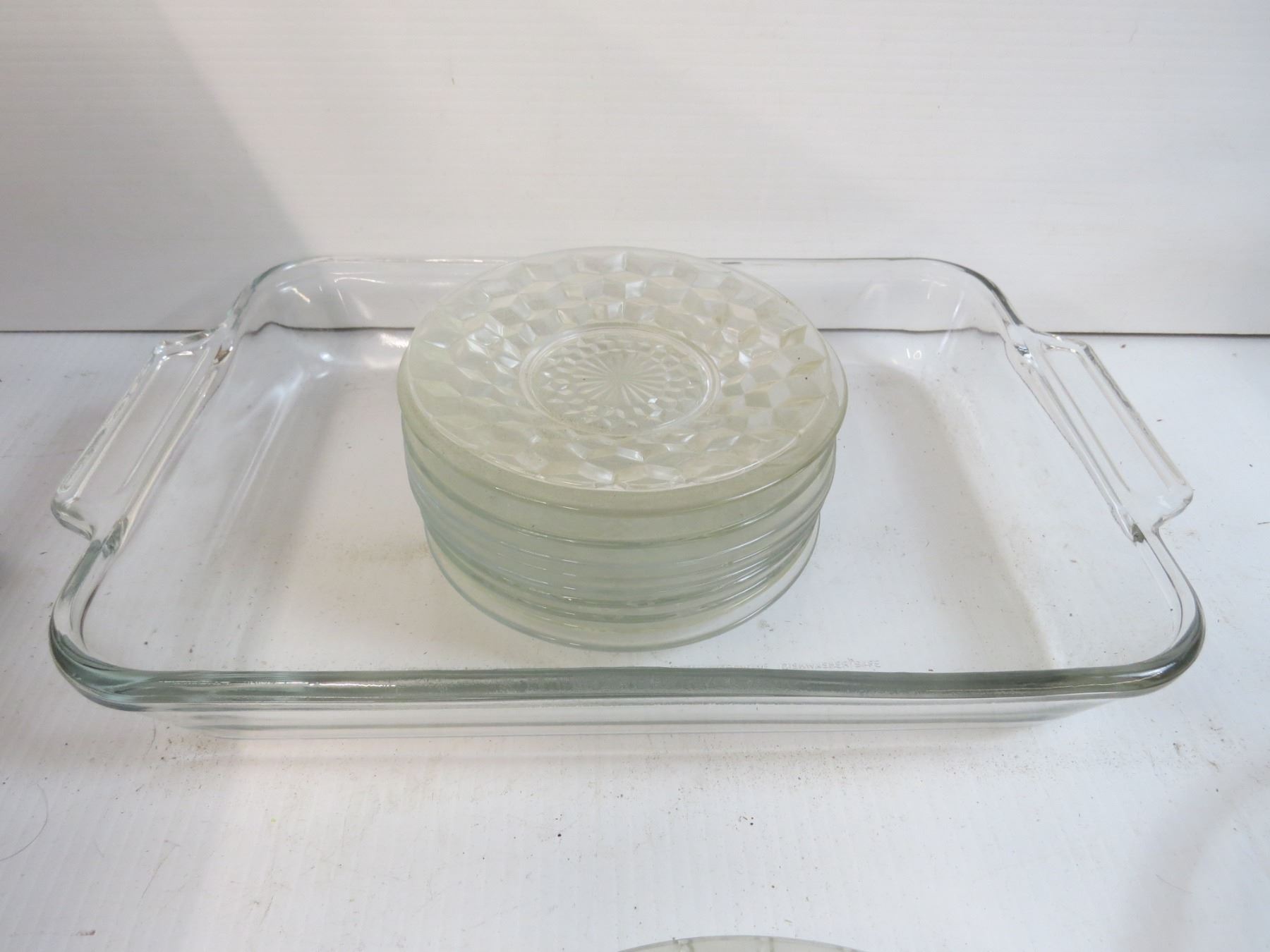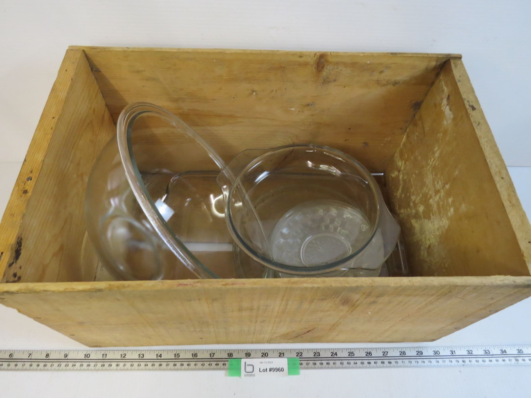 Wooden B.C.Fruit Crate - Anchor Glass Cake Pan - Lg Mixing Bowl - Misc Glass Ware