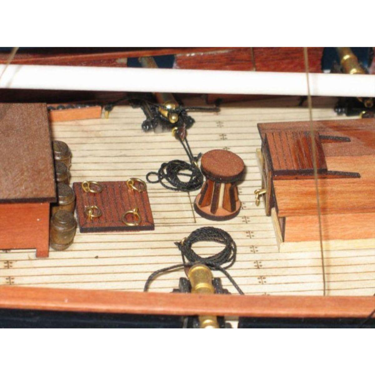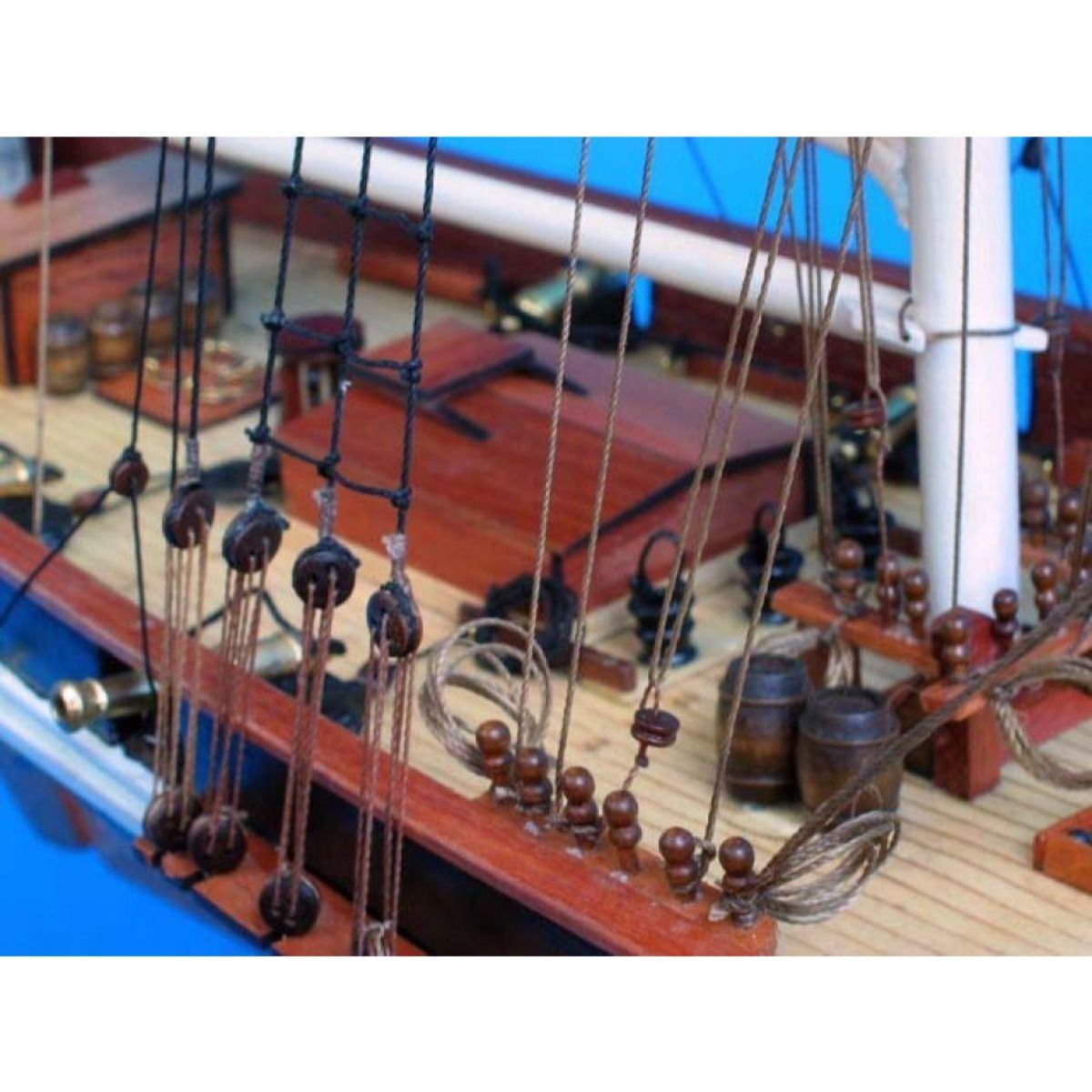 The heyday of the Baltimore clippers is recalled in the fine craftsmanship and attention to detail of these model tall ships. Used by traders, privateers, pirates, merchants and smugglers alike during the era of the War of 1812, these Baltimore clippers are historically accurate scale models. This replica tall model ship proudly displays her exquisitely-crafted features and indomitable spirit of adventure whether seated at a table, desk or shelf. 32" Long x 9" Wide x 24" High (1:56 scale) Built from scratch by master artisans Individual wooden planks used in plank-on-frame hull construction High-quality woods include cherry, birch, maple and rosewood Extensive rigging featuring more than 100 blocks and deadeyes Amazing Details, Including: Numerous deck and hull details, such as painted railings, capstans and other deck features, detailed deckhouses plus much more Cannon accurately tied to deck to reduce recoil Additional nautical items such as cannon balls, barrels, rope coils and more cover the decks Masterfully stitched, heavy canvas sails hold shape and do not wrinkle Taut rigging with varied thread gauge and color with scores of triple deadeye Planked deck with nail holes  Meticulous painting accurately matches actual Baltimore clippers of the era Wooden display base features four arched dolphins Pictured with marble base (available for purchase) Extensive research of original plans, historical drawings, and paintings, as well as actual photographs, ensures the highest possible accuracy.