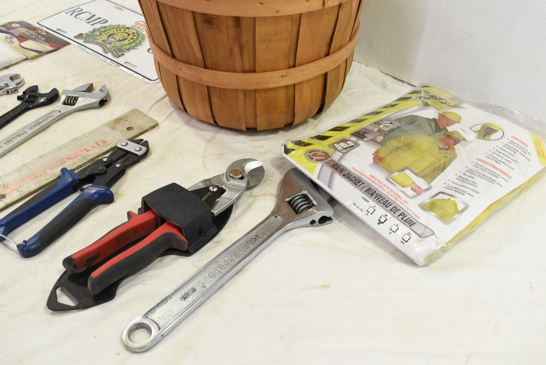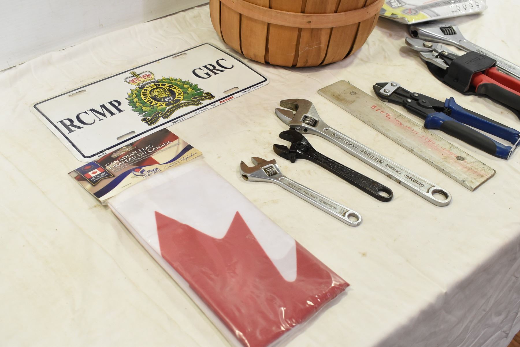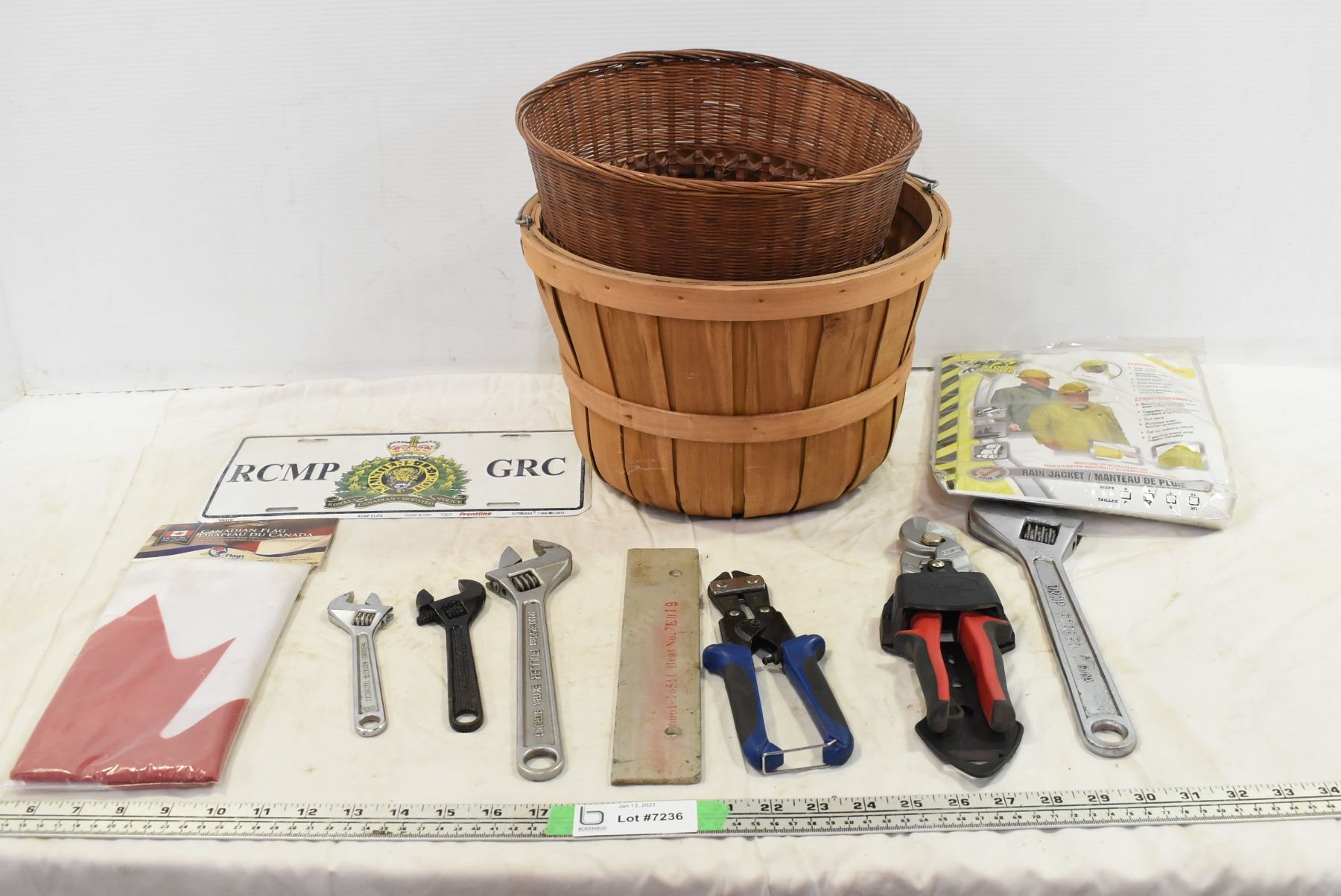 Wooden Baskets, RCMP Plate, Canada Flag & Tools