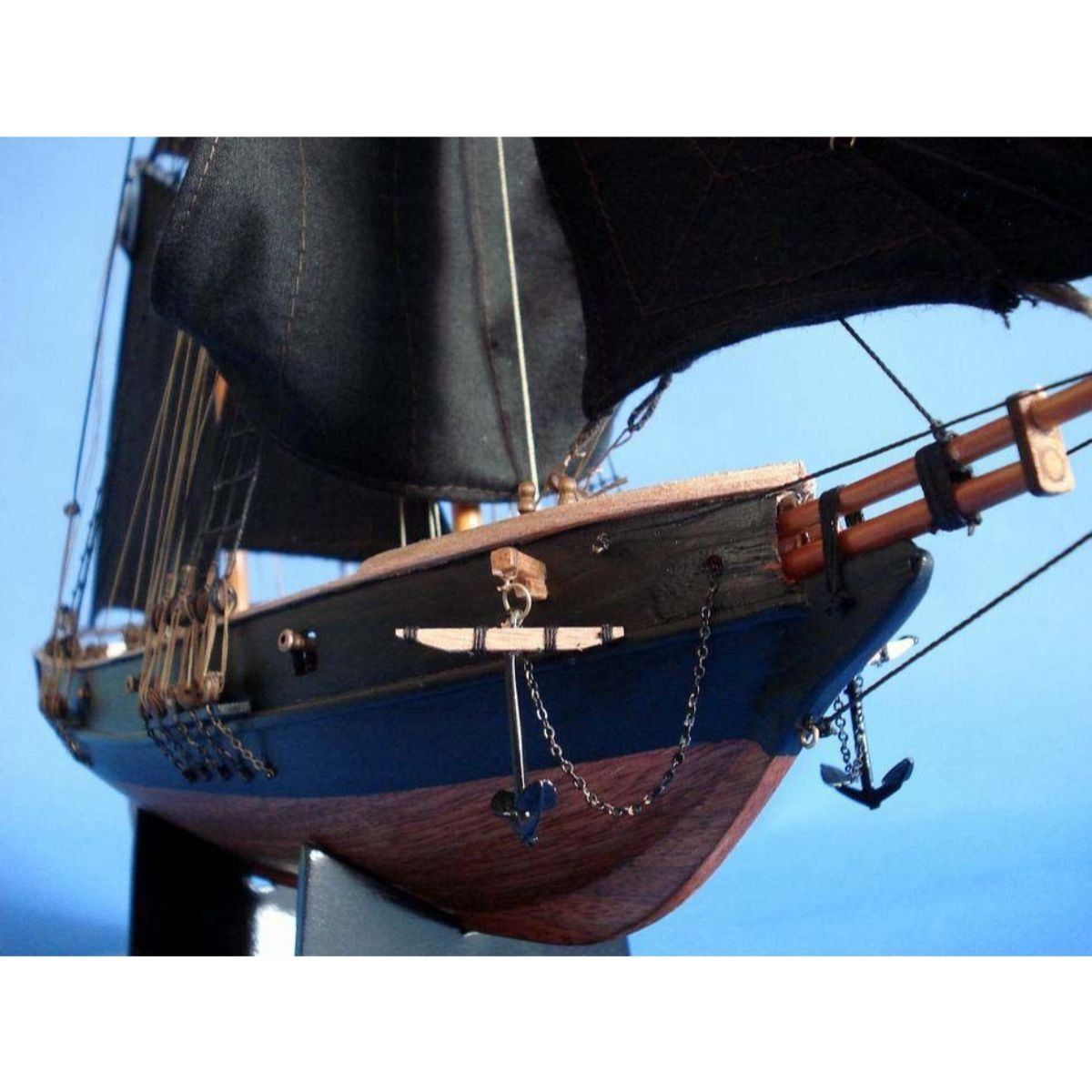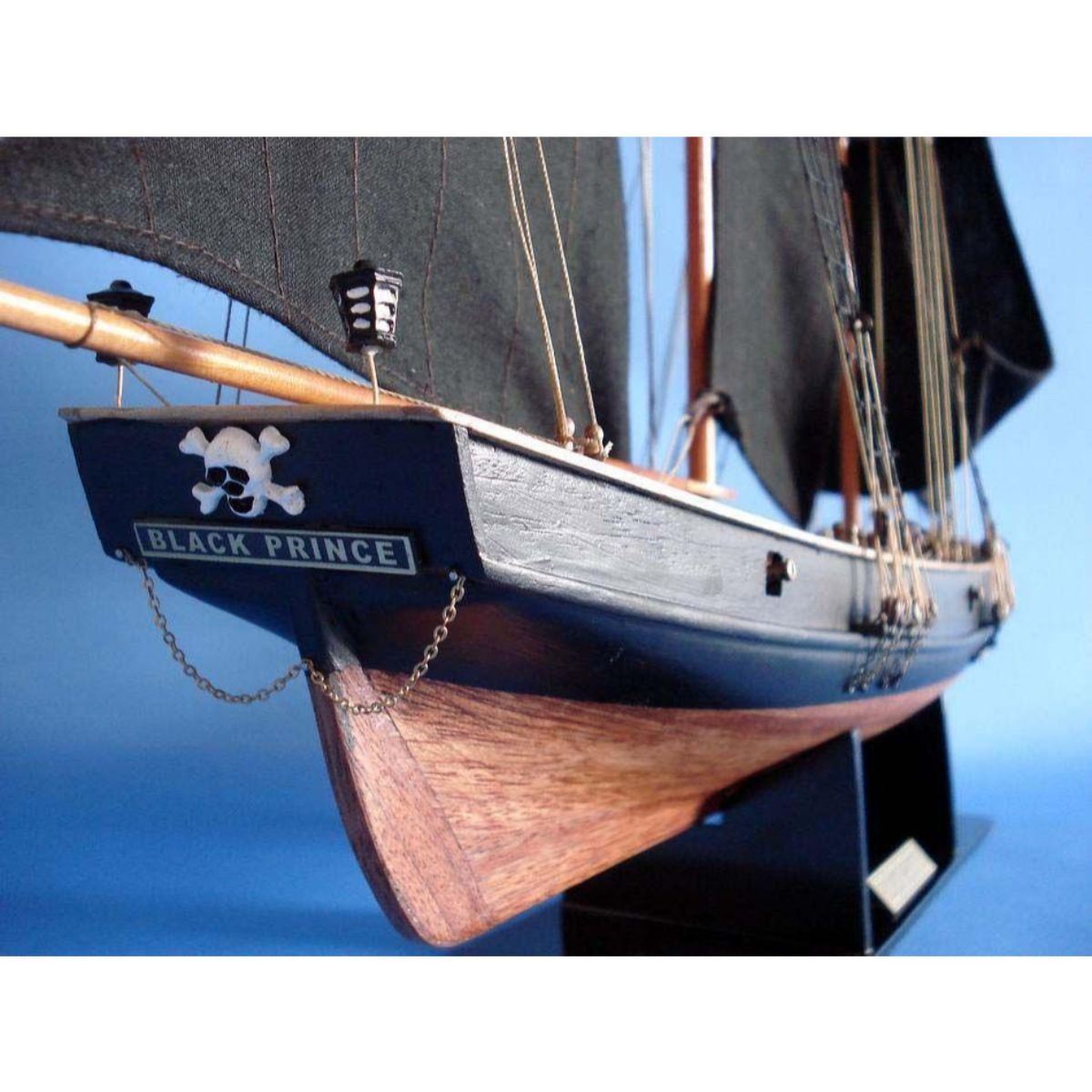 Wooden Ben Franklin's Black Prince Limited Model Ship 24" SOLD FULLY ASSEMBLED Ready for Immediate Display - Not a Model Ship kit The Black Prince is a highly accurate and detailed scale model yacht designed for the discriminating sailboat or tall ship enthusiast. This museum quality tall model ship is a replica topsail schooner of the first privateer with Letters of Marque by the Continental Congress during the Revolutionary War, and commissioned by Benjamin Franklin himself. This fine tall ships model is authentically painted and rigged in black, which earned the Black Prince both her name as well as a reputation as a nighttime terror in British waters, and she will bring an added spirit of excitement and adventure to any home or office as she sits perfectly sized for any small shelf, desk or mantle. 24" Long x 5" Wide x 16" High (1:45 scale) Built from scratch by master artisans Individual wooden planks used in plank-on-frame hull construction High quality woods include cherry, birch, maple and rosewood Extensive rigging and historically accurate sails Gun ports actually cut into the hull Amazing Details, including: Planked deck with nail holes Rope coils, deck cleats and other nautical items adorn decks Lattice grates, rudder chains, wooden ladders and planked steps Solid brass cannons and metal anchors Masterfully stitched, heavy canvas sails hold shape and do not wrinkle Taut rigging with varied thread gauge and color Meticulous painting accurately matches actual pirate ships Removable base features Black Prince nameplate Limited production run of these tall ship models Extensive research of our tall ship models from original plans, historical drawings and paintings as well as actual photographs ensures the highest possible accuracy