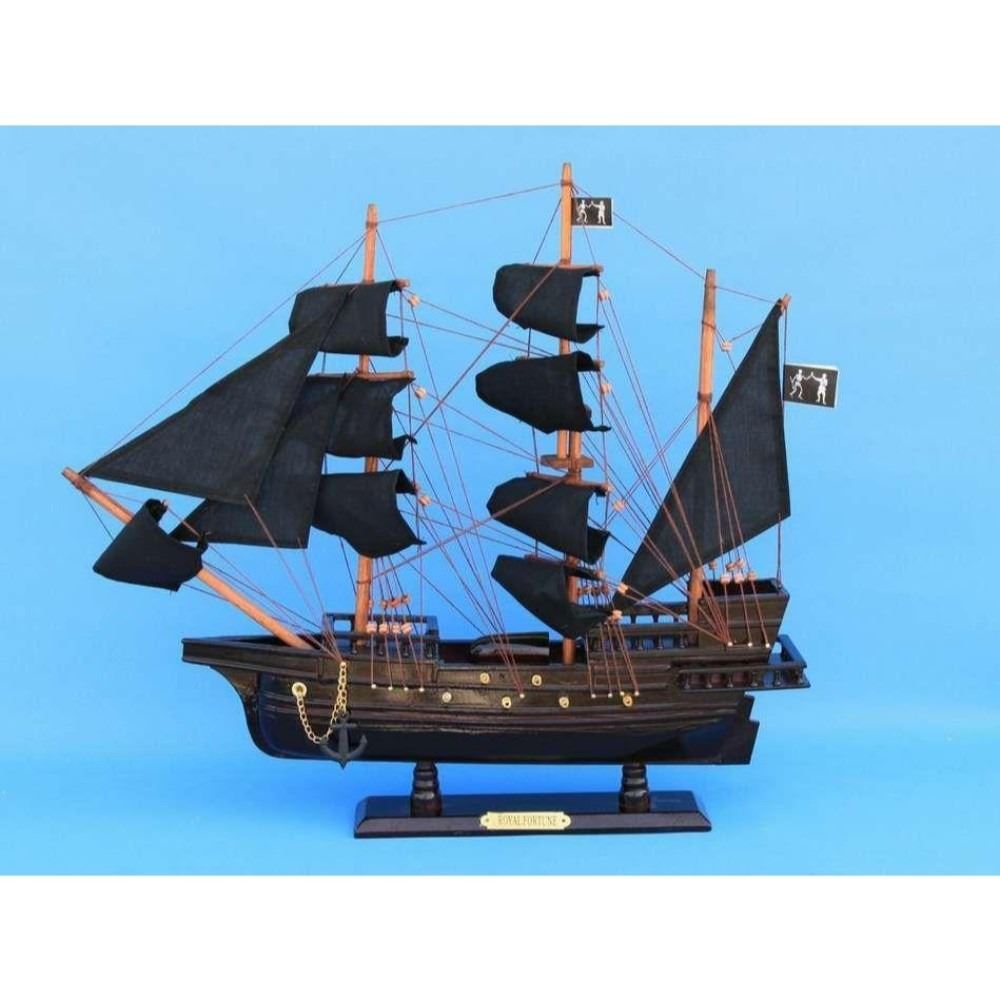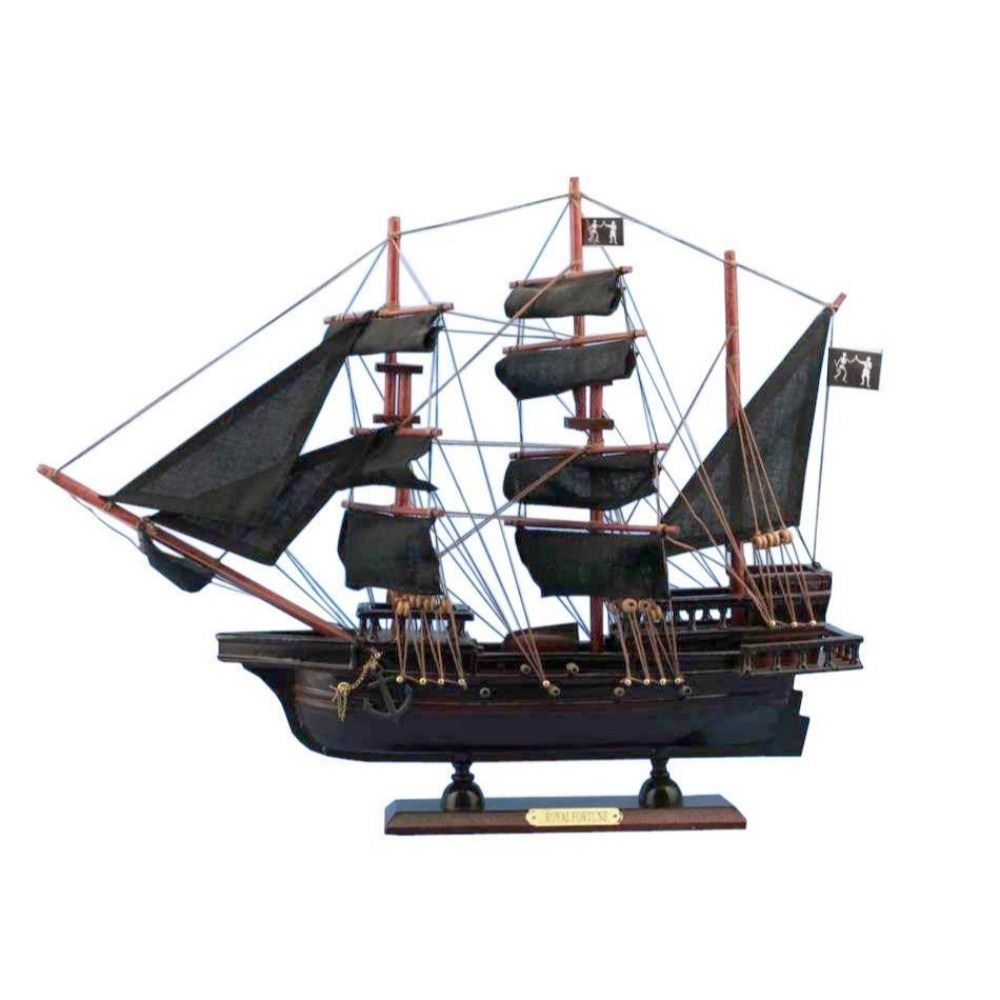 Wooden Black Bart's Royal Fortune Model Pirate Ship 20" SOLD FULLY ASSEMBLED Ready for Immediate Display - Not a Model Ship kit  Adventure on the high seas awaits with this pirate ship decorative model of the Royal Fortune captained by Black Bart.  This adorable pirate ship decoration rest easily upon any shelf or desk and this tall model ship adds a touch of brave adventure to any room’s decor.  20" Long x 5" Wide x 17" High (1:135 scale) Arrives fully assembled with all sails mounted High quality woods include cherry, birch, maple and rosewood Handcrafted wooden hull and masts 11 handsewn black cloth sails Metal nameplate on wooden base identifies the ship as the Royal Fortune