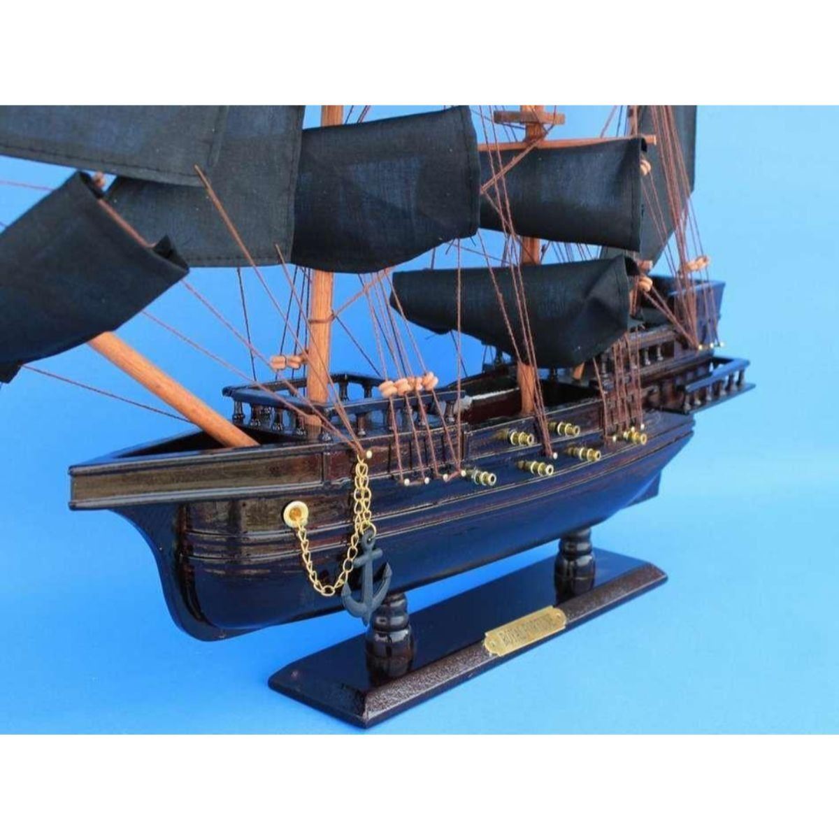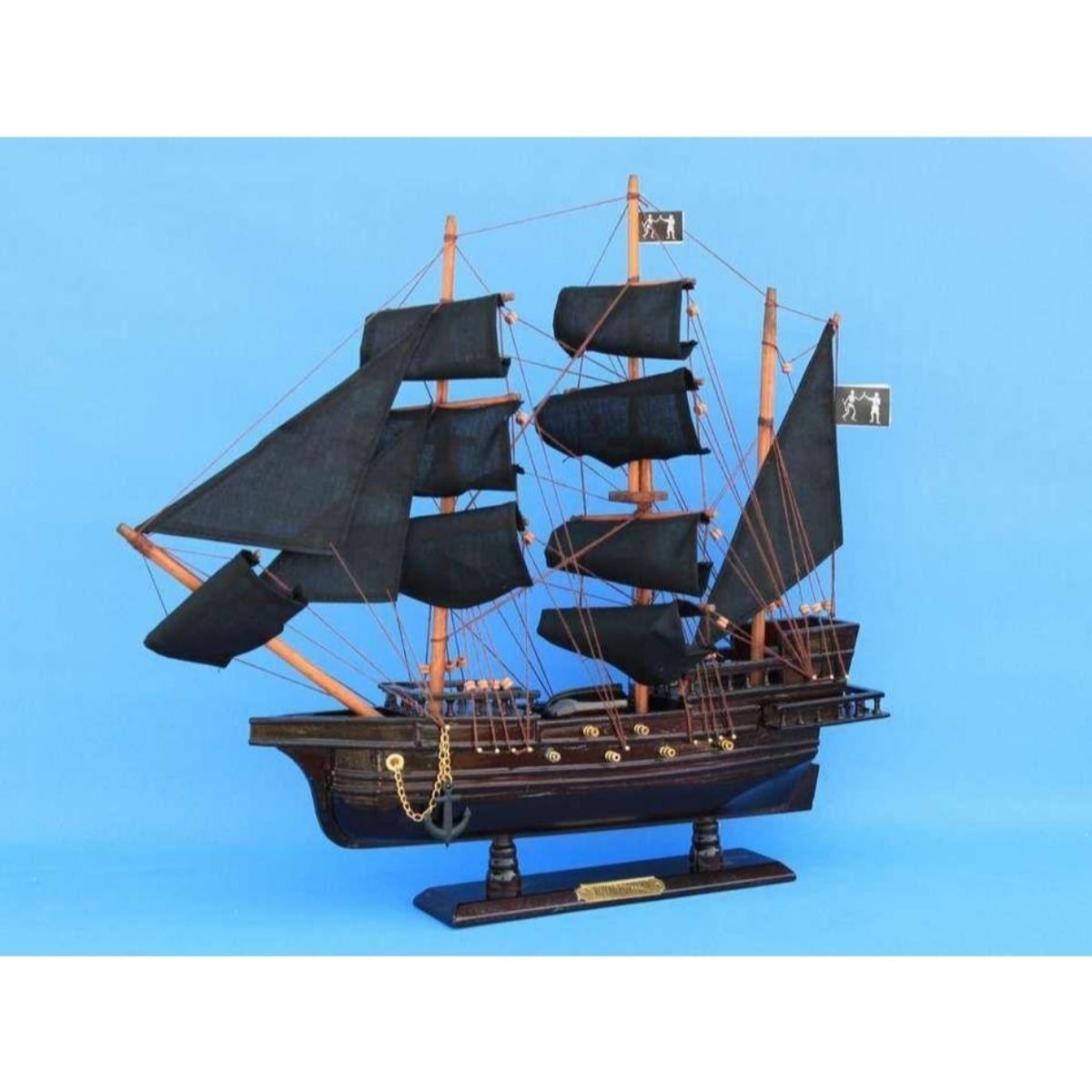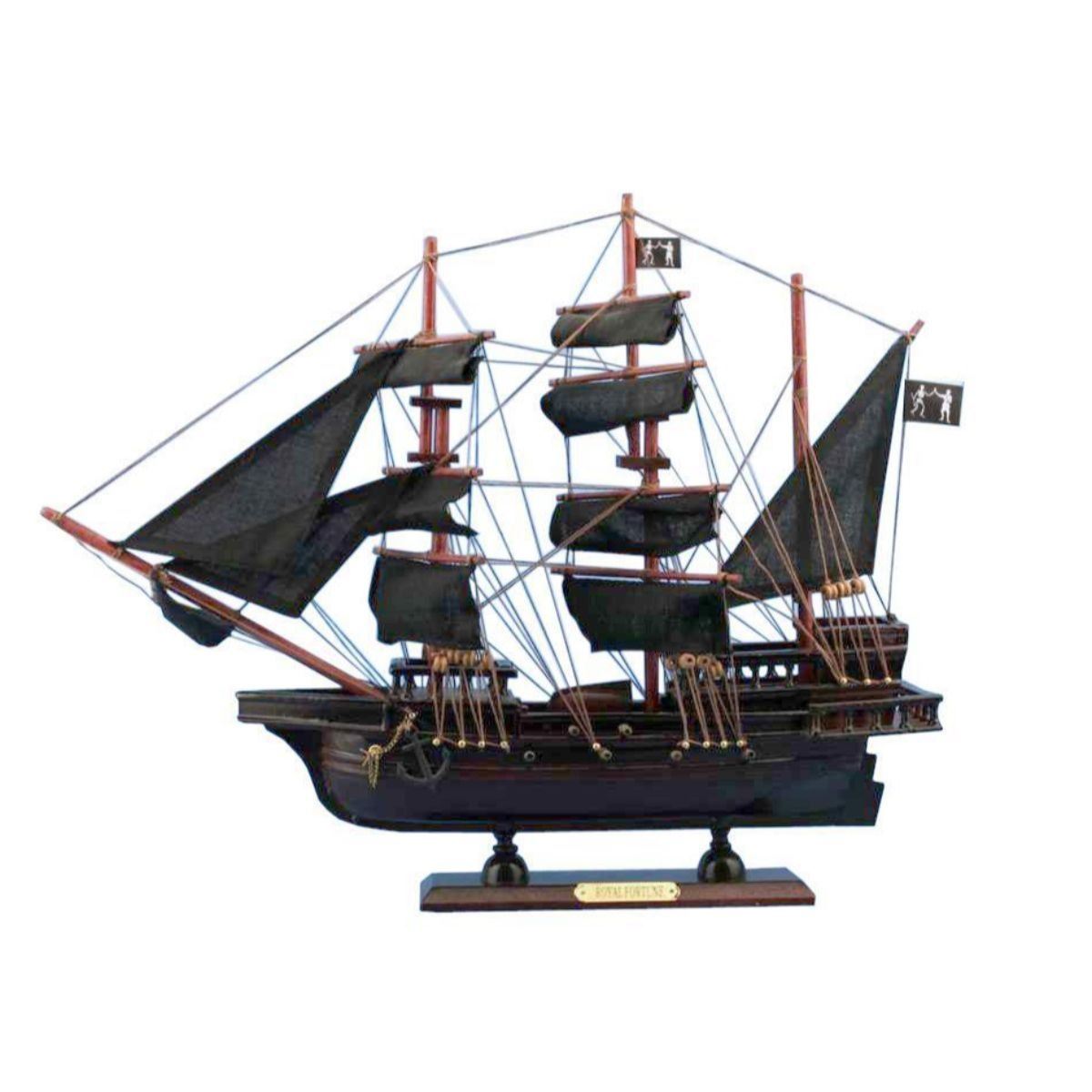 Wooden Black Bart's Royal Fortune Model Pirate Ship 20" SOLD FULLY ASSEMBLED Ready for Immediate Display - Not a Model Ship kit Adventure on the high seas awaits with this pirate ship decorative model of the Royal Fortune captained by Black Bart. This adorable pirate ship decoration rest easily upon any shelf or desk and this tall model ship adds a touch of brave adventure to any room’s decor. 20" Long x 5" Wide x 17" High (1:135 scale) Arrives fully assembled with all sails mounted High quality woods include cherry, birch, maple and rosewood Handcrafted wooden hull and masts 11 handsewn black cloth sails Metal nameplate on wooden base identifies the ship as the Royal Fortune