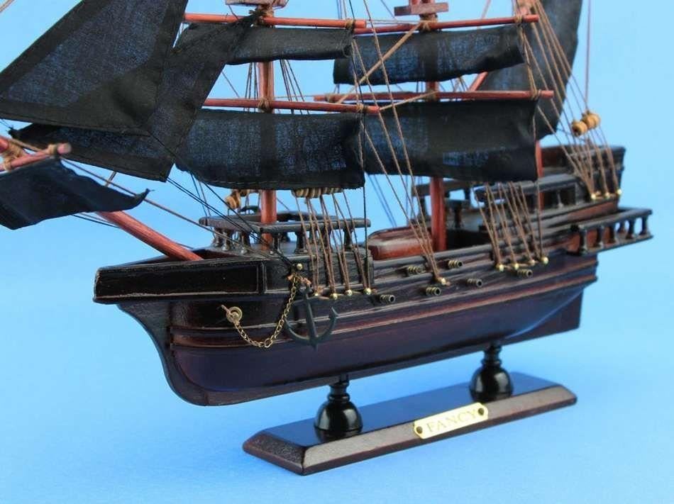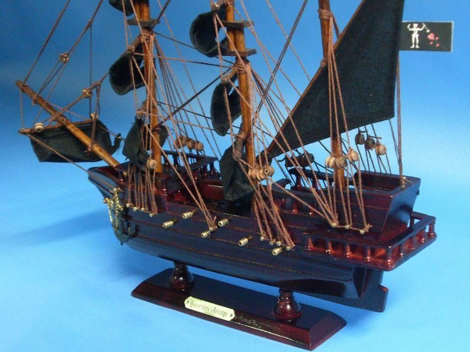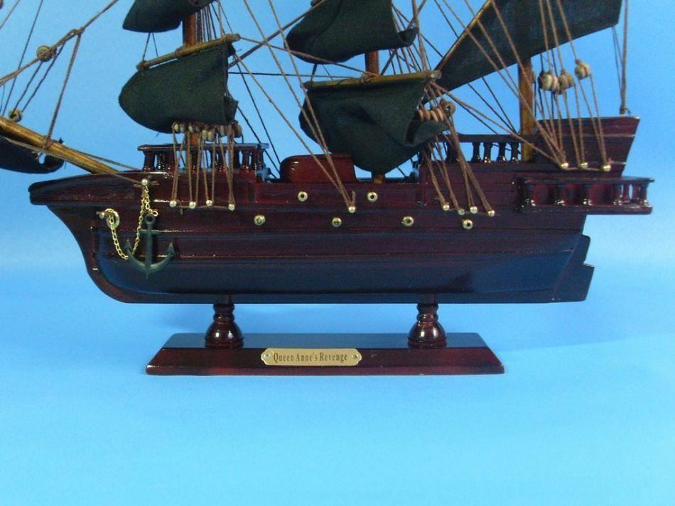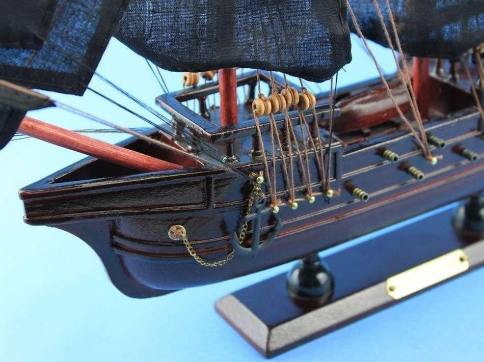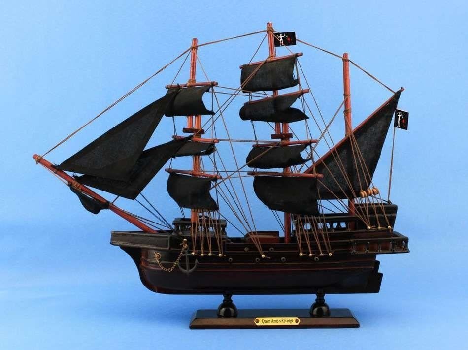 Wooden Blackbeard's Queen Anne's Revenge Model Pirate Ship 15" SOLD FULLY ASSEMBLED Ready for Immediate Display - Not a Model Ship kit Adventure on the high seas awaits with this pirate ship model, the historic vessel that carried the notorious pirate Blackbeard on his conquests across vast seas. These adorable tall ship models rest easily upon any shelf or desk, and add a touch of adventure and excitment to any room’s decor.  Arrives fully assembled with all sails mounted High quality woods include cherry, birch, maple and rosewood Handcrafted wooden hull and masts 11 handsewn black cloth sails Proudly displays Blackbeard's notorius flag Metal nameplate on wooden base identifies the ship as the Queen Anne's Revenge