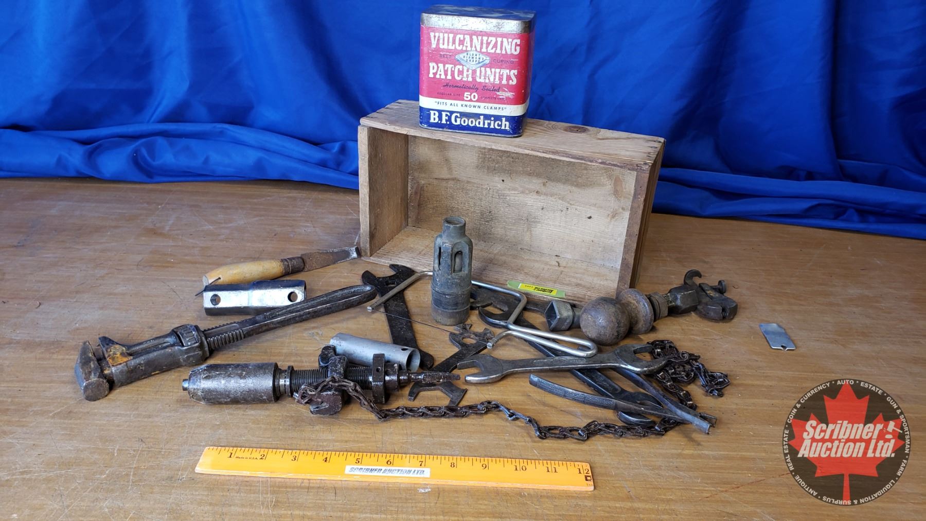 Wooden Box Lot: Wrenches & BF Goodrich Patch Units (5"H x 13"W x 7"D)