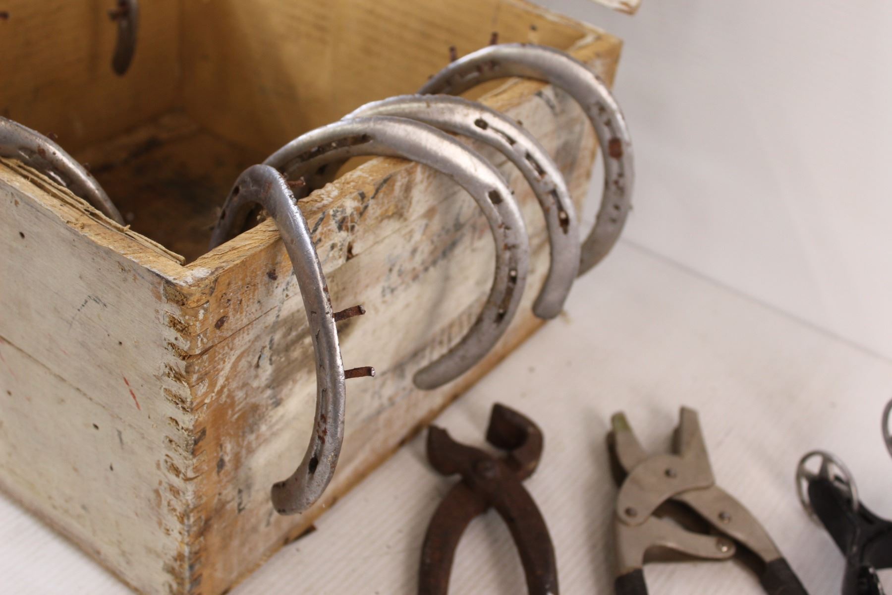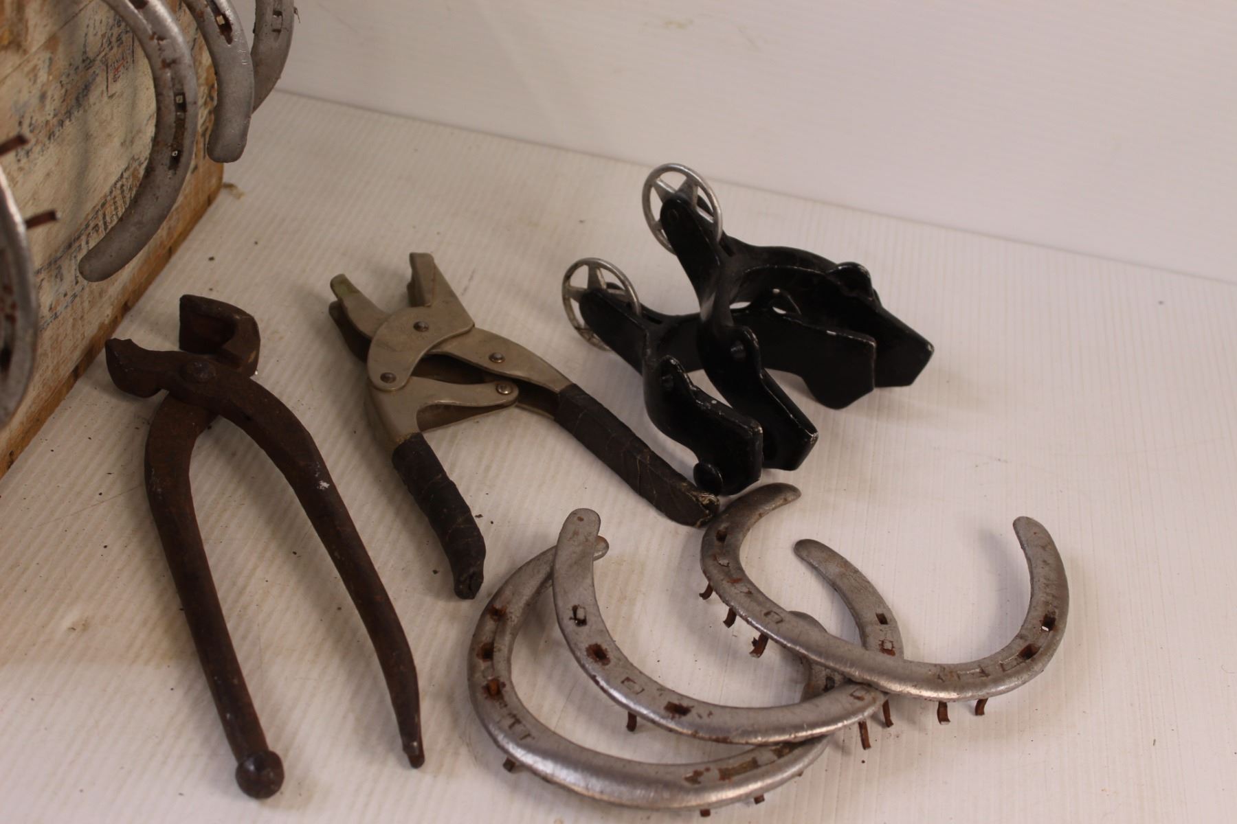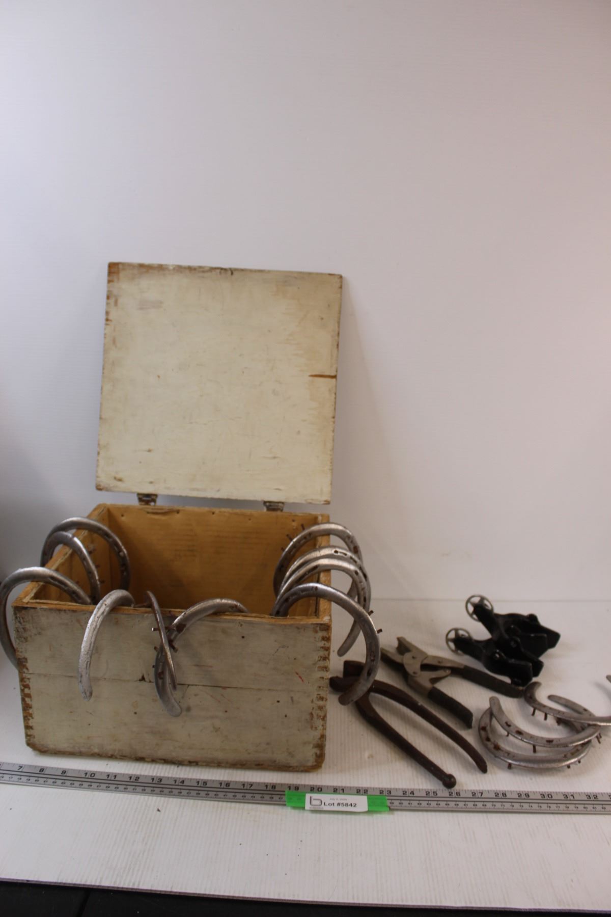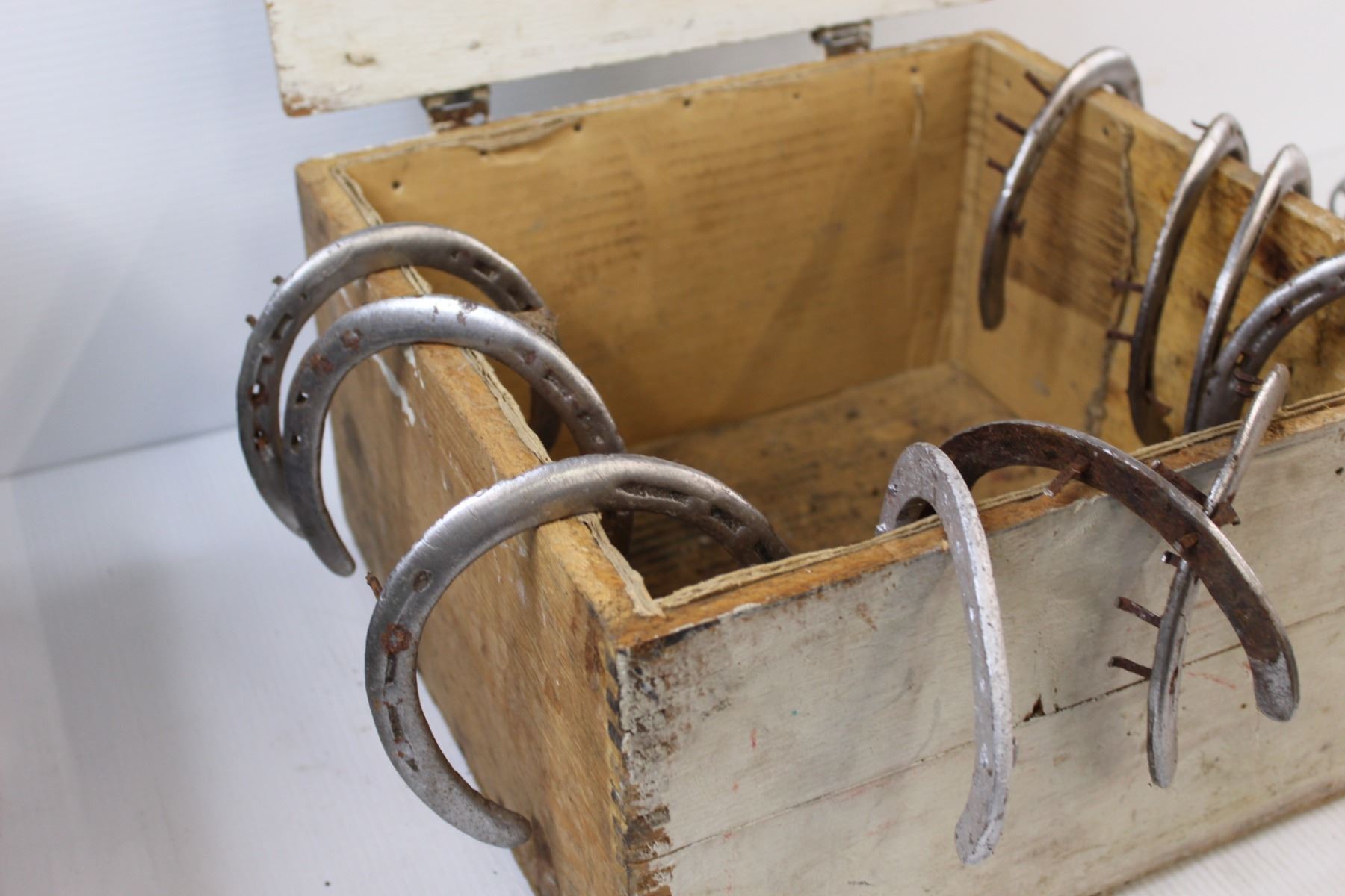 Wooden Box of Horseshoes & Tools, Set of Spurs
