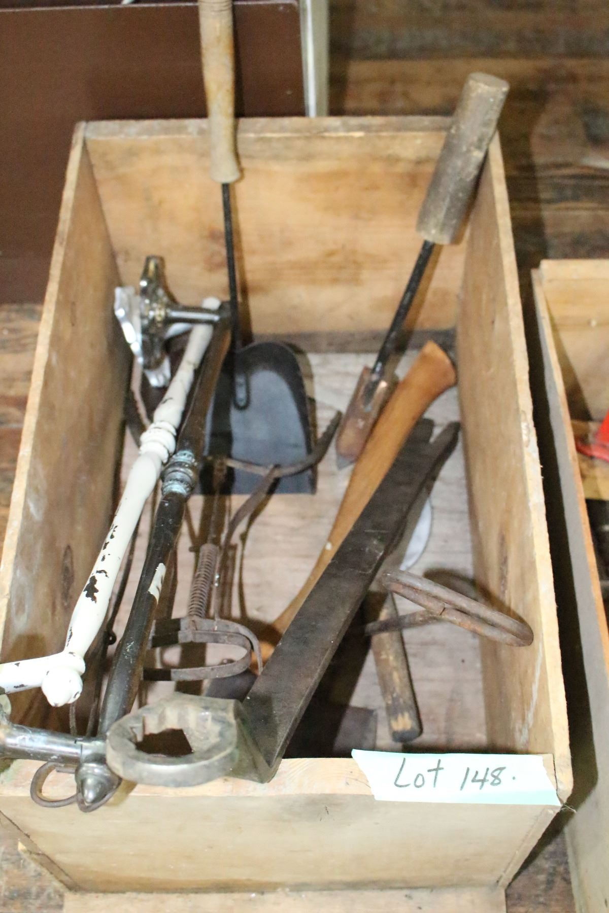 Wooden Box w/Assorted Tools & a Hatchet