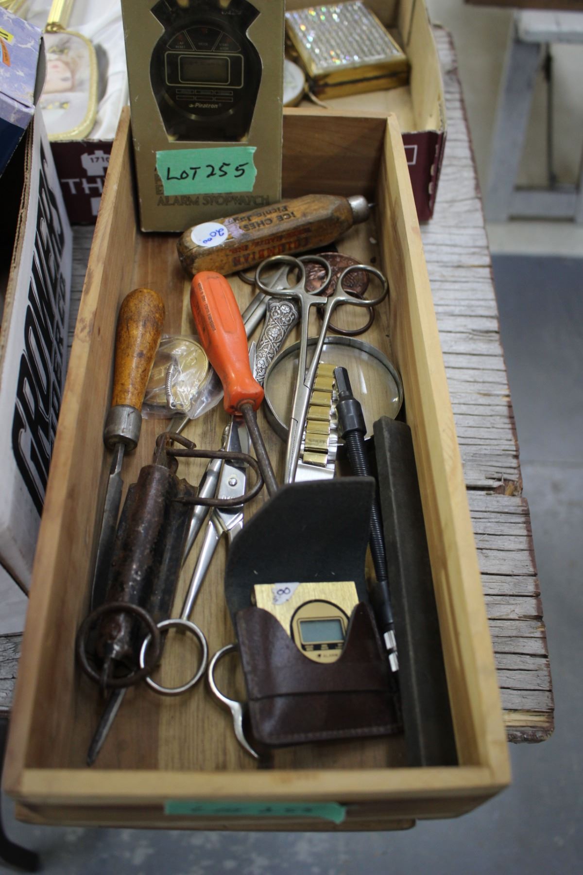 Wooden Box with a Magnifying Glass, Stop Watch, Scissors, Vintage Ice Pick, Hone, Fish Scale, etc.
