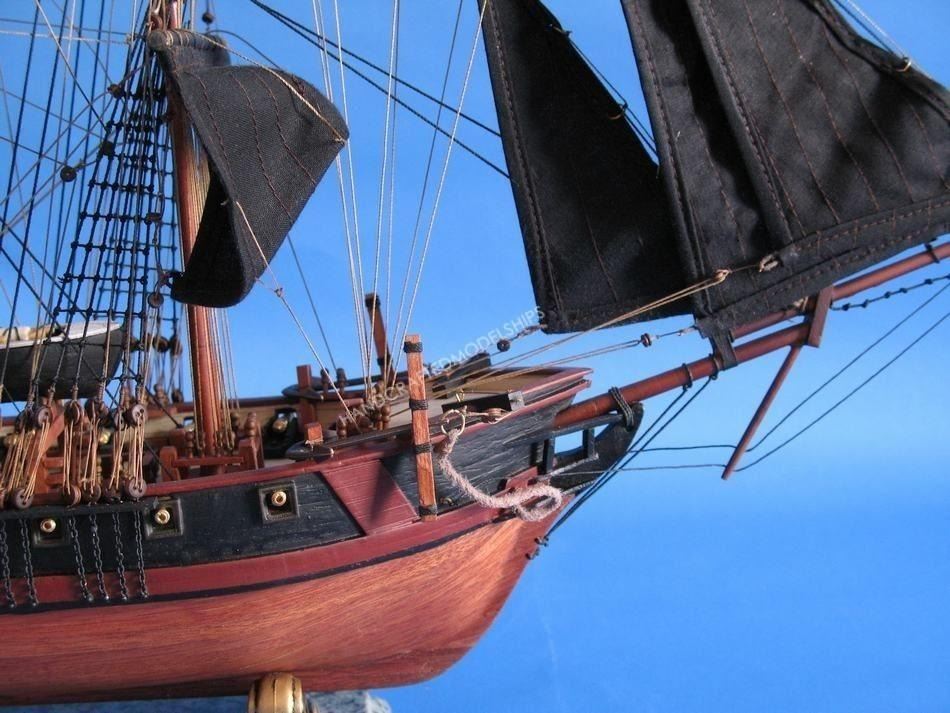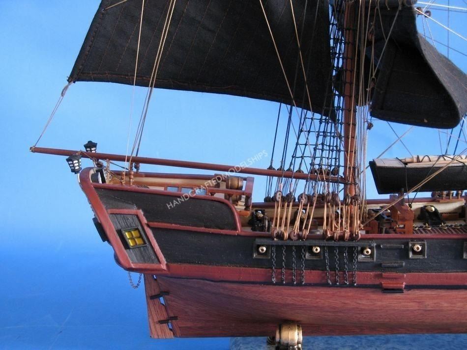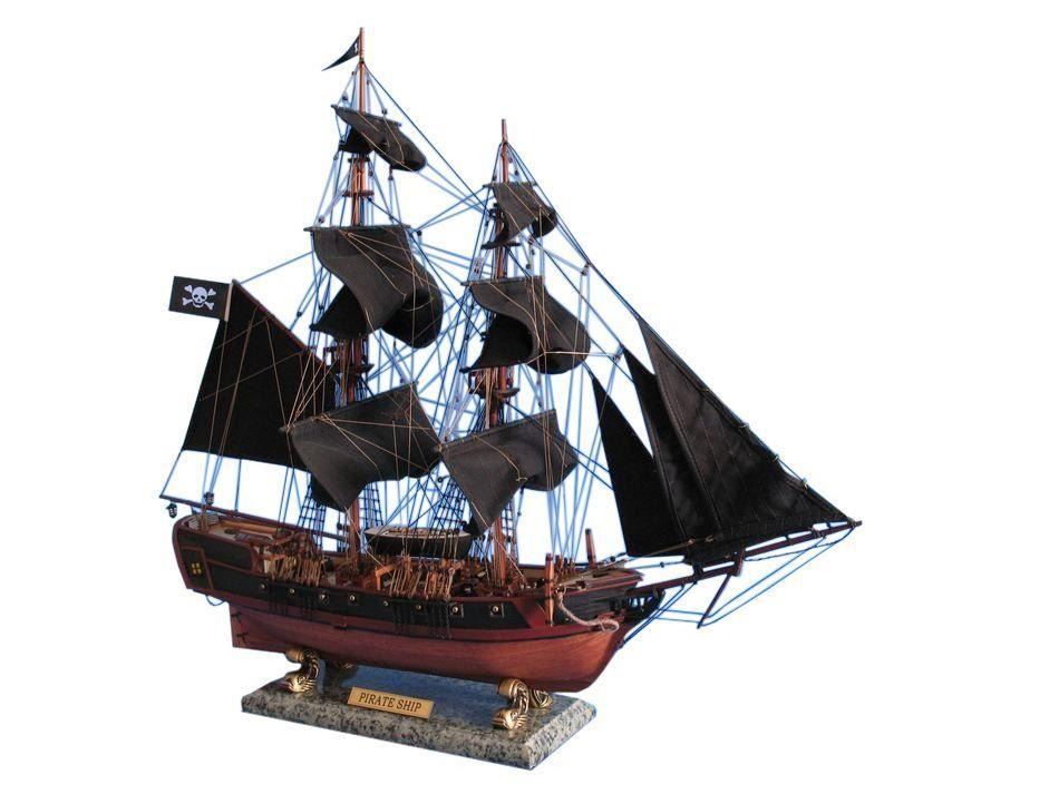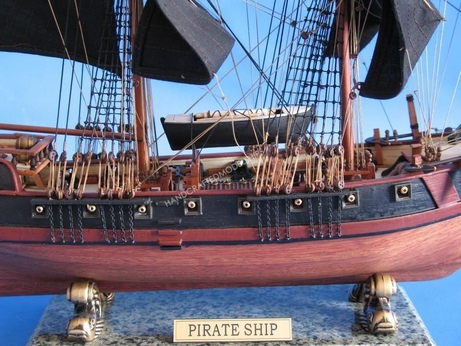 Wooden Caribbean Pirate Ship Model Limited 26" - Black Sails Search for lost treasure as you set sail for adventure on the high seas aboard this scale tall model ship replica of a Caribbean pirate ship. This exquisitely constructed sailing ship is highlighted by fine craftsmanship and attention to detail. These Caribbean pirate ship models proudly display their exquisitely-crafted features whether seated upon a shelf, desk, or table and bring an indomitable spirit of adventure to any room or office. Built from scratch by master artisans Individual wooden planks used in hull construction High-quality woods include cherry, birch, maple, and rosewood Extensive rigging features over 100 blocks and deadeyes Gun ports actually cut into the hull Amazing Details, including: Planked deck with nail holes Authentic scale lifeboat with oars Rudder chains, metal anchors, cannonball racks Fine-crafted embellishments carved on stern below twin lanterns Additional deck details such as cannon balls, barrels, rope coils, and other nautical items 10 masterfully stitched, heavy canvas sails hold shape and do not wrinkle Taut rigging with varied thread gauge and color