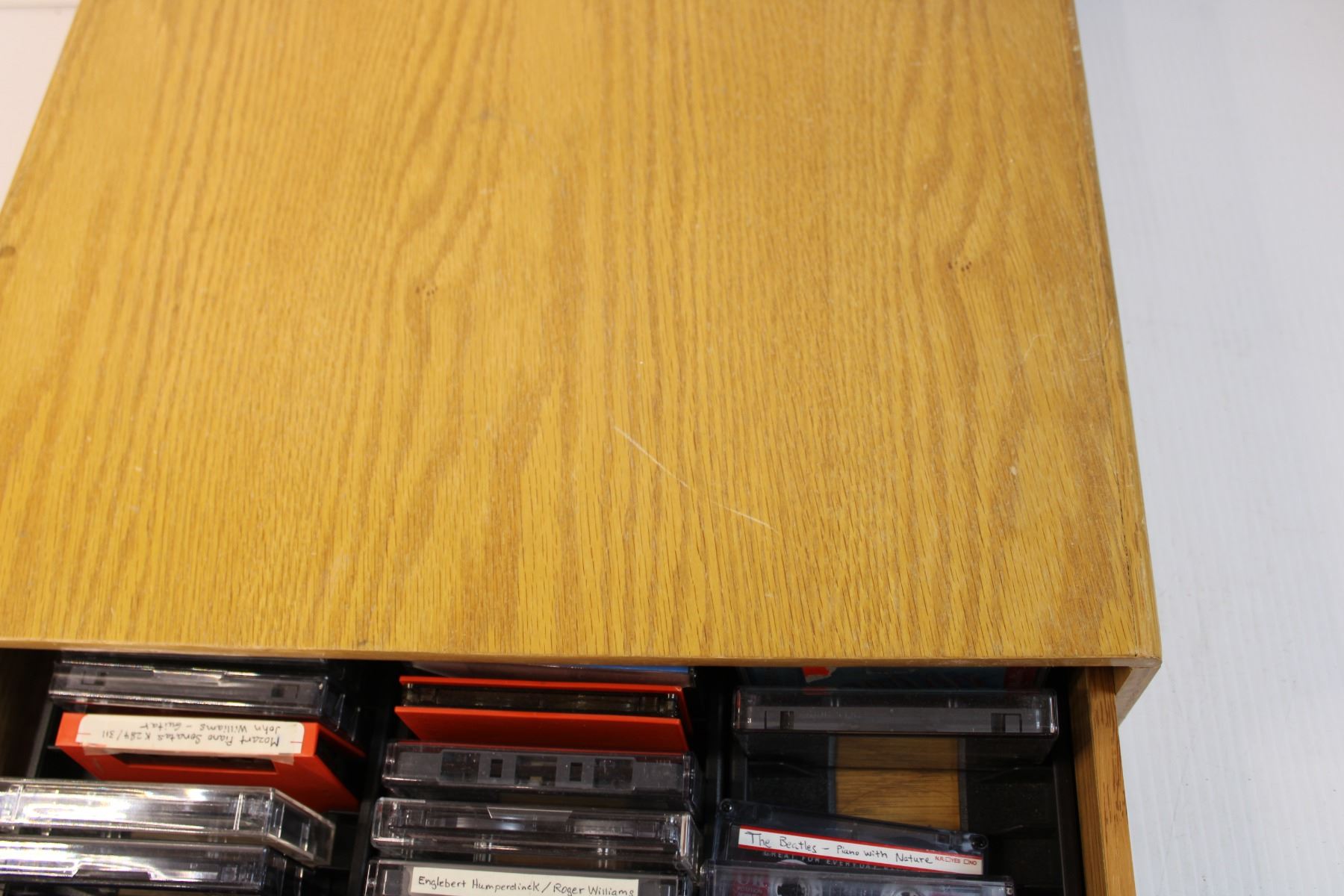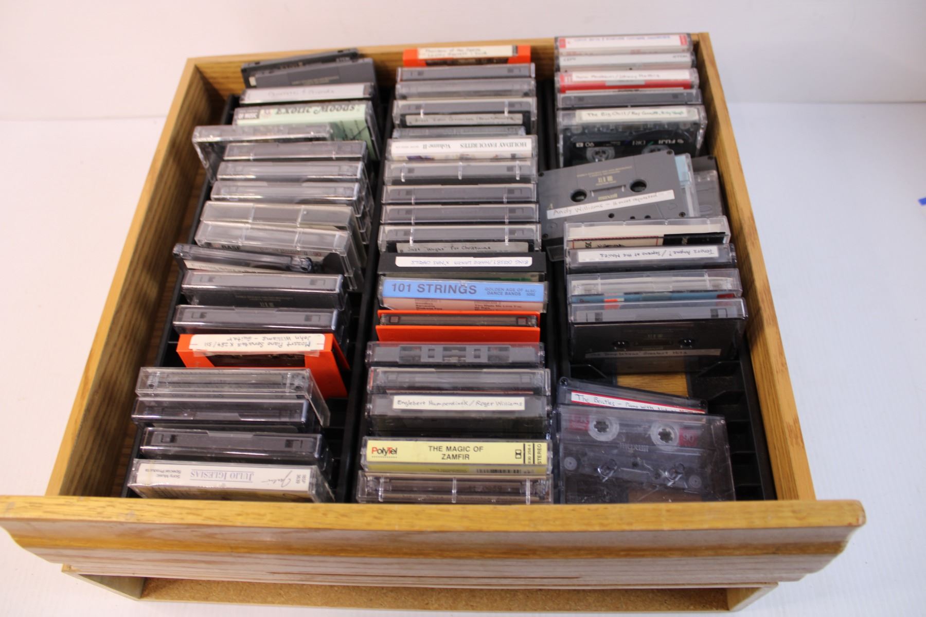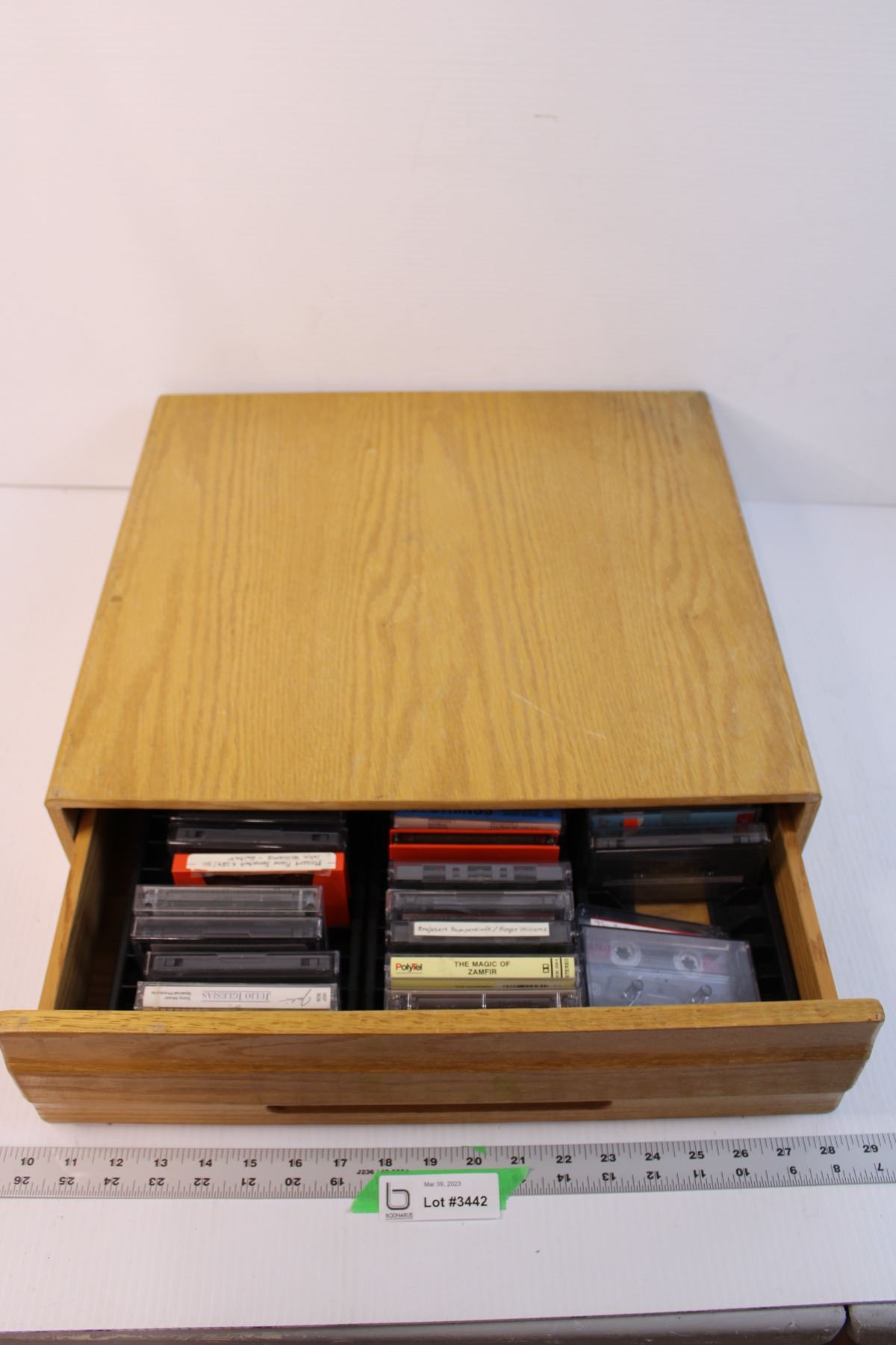 Wooden Cassette Tape Holder with Misc. Cassettes (Some Scratches on Top of Holder)