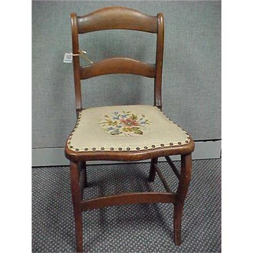 Wooden Chair with Embroidered Seat- This unique and lovely chair is constructed of a dark wood, perhaps walnut, and features an off white fabric seat embroidered with a floral design. The wood is in great condition with only a few minor scratches and is very sturdy and usable. Perfect for a country rustic or vintage home decor! 32" tall, 17" wide, 15" seat width and 16" height for the seat back- All measurements are approximate.